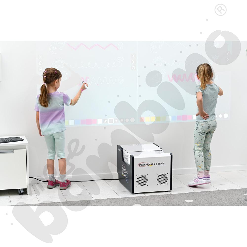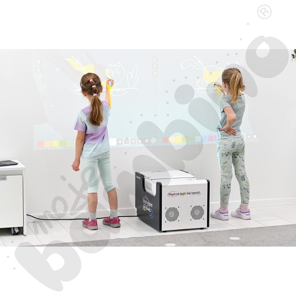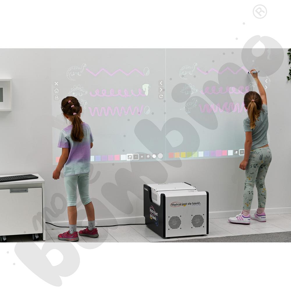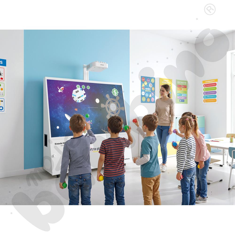 • Nowość! Większa powierzchnia interakcji: Knowla Box pozwala na wyświetlanie obrazu o przekątnej od 85 do nawet 150 cali z zachowaniem interakcji pisakami oraz piłeczkami. Idealnie możemy np. wyświetlać ekran na ścianie na sali gimnastycznej podczas szkolnych wydarzeń.