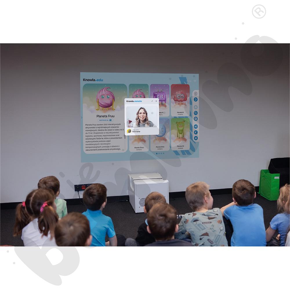 Knowla Remote to intuicyjne rozwiązanie zwiększające elastyczność prowadzenia zajęć, wspiera nowoczesne metody nauczania i oszczędza czas nauczyciela. Knowla Box ma dostosowania do Specjalnych Potrzeb Edukacyjnych: przesuwanie pola obrazu, ściszanie dźwięku, dostosowywanie tempa poruszania się obiektów, zmiana koloru tła, głosowe komendy oraz głosowa informacja zwrotna, włączanie/wyłączanie efektów świetlnych. Mobilne, edukacyjne urządzenie multimedialne Knowla Box zostało stworzone do obsługi pakietów aplikacji Edukacyjny Wszechświat Knowla (planet tematycznych), ale może też służyć jako samodzielne centrum multimedialnej edukacji i rozrywki. Dzięki wbudowanemu komputerowi z systemem Windows 11 oraz portami HDMI i USB, można korzystać z internetu, odtwarzać filmy, prezentacje czy wykorzystać go do grupowej zabawy, np. karaoke. W tym samym czasie może korzystać nawet do 10-15 osób!
