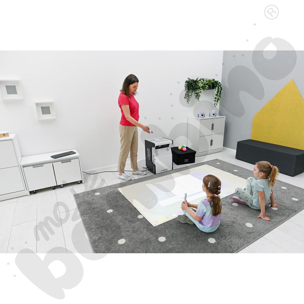 • w pełni złożone urządzenie gotowe do uruchomienia. Wymiary urządzenia: 36,8 cm × 39,7 cm × 58,3 cm. Wymiary wyświetlanego obrazu: od 88'' (189 × 118 cm) do nawet 156'' (336 × 210 cm) przy zachowaniu ostrości oraz wszystkich interakcji (klawiatura z touchpadem, piłeczki, interaktywne pisaki – producent projektora Epson zapewnia interakcję pisakami do 100''),