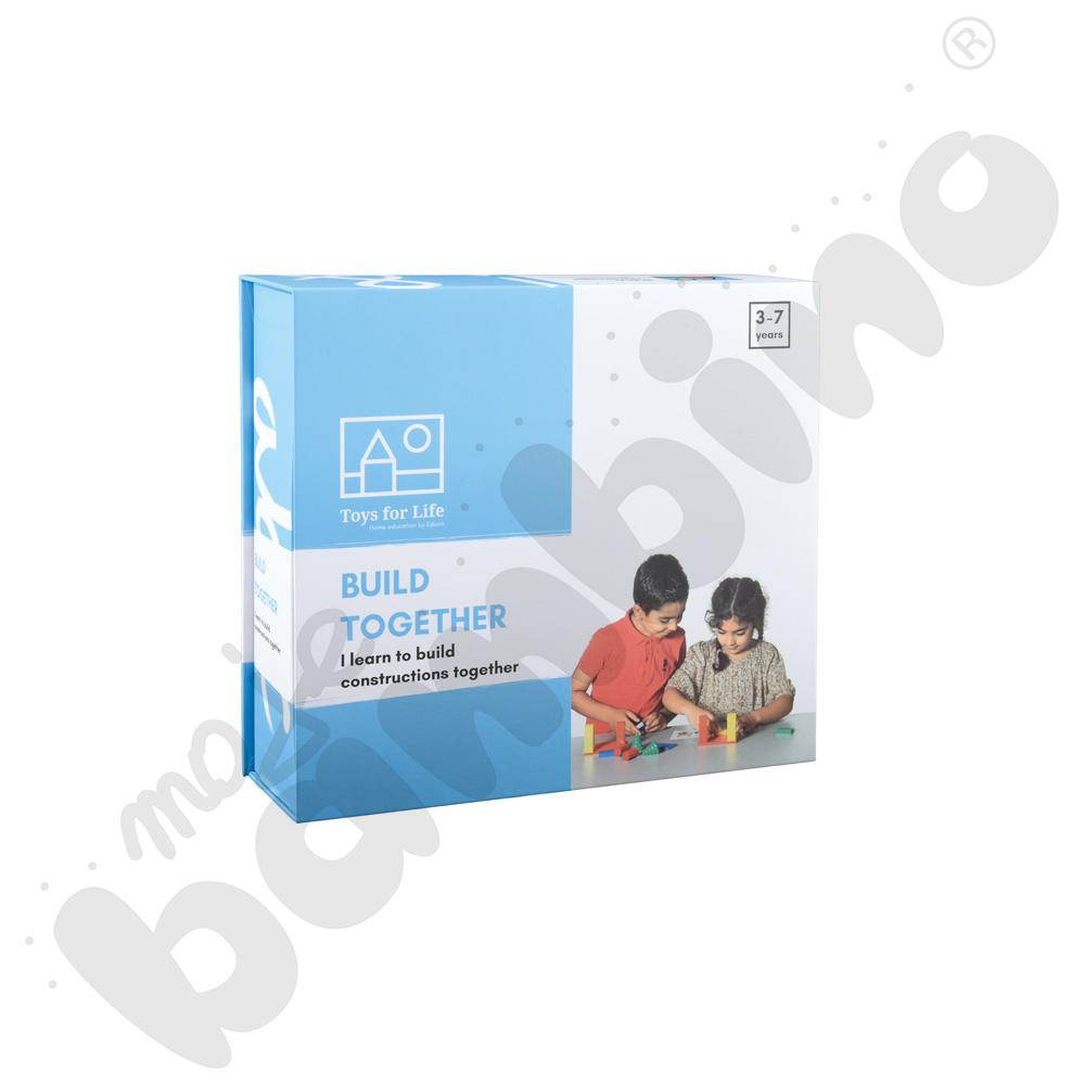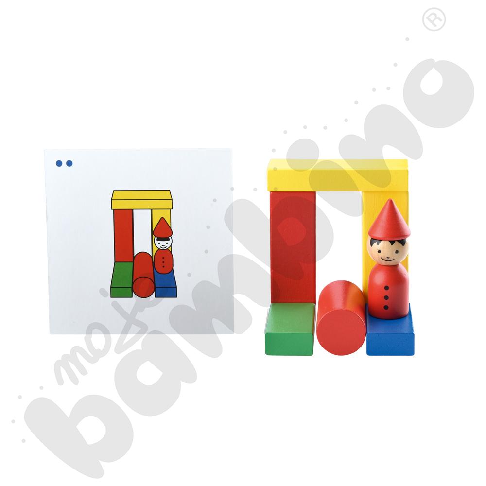 Zestaw do układania konstrukcji z kolorowych bloczków na podstawie wzorów zawartych na kartach aktywności. Dzieci mogą pracować w parze, tak aby jedna osoba dyktowała polecenia, a druga odtwarzała wzór. Karty są oznaczone kropkami oznaczającymi rosnący poziom trudności wzorów. Dzieci mogą układać bloczki również na podstawie własnego pomysłu.