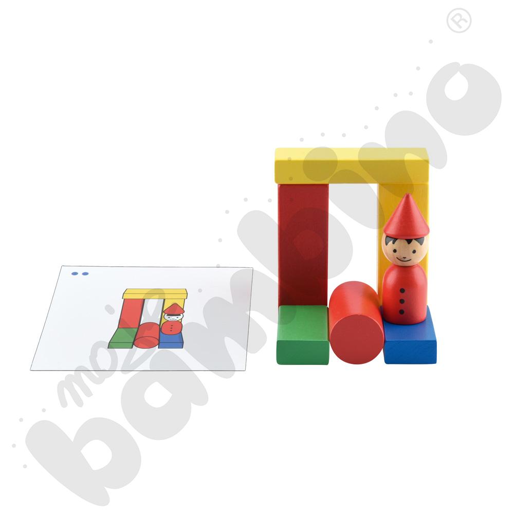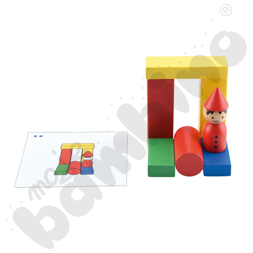 • 8 podwójnych drewnianych bloczków: czerwony kwadrat 12 x 12, niebieski prostokąt 7,5 x 5 cm, niebieski graniastosłup 5 x 2,5 x 5 cm , czerwony graniastosłup 7,5 x 2,5 x 7,5 cm, czerwony walec 2,5 x 7,5 cm, żółty graniastosłup 7,5 x 2,5 x 7,5 cm i 7,5 x 1 x 7,5 cm, zielony graniastosłup 5 x 1 x 5 cm