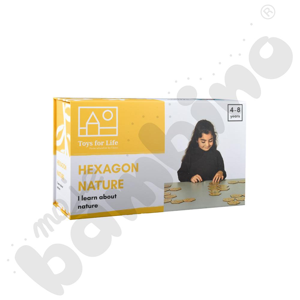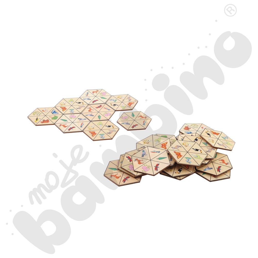 Gra polegająca na dopasowywaniu obrazków zawartych na drewnianych heksagonach. Razem z zestawem dziecko ćwiczy koncentrację, dyskryminację wzrokową, wyobraźnie przestrzenną, motorykę małą oraz poszerza zasób słownictwa. • 30 heksagonów • wym. heksagonów 9,5 x 8,5 cm