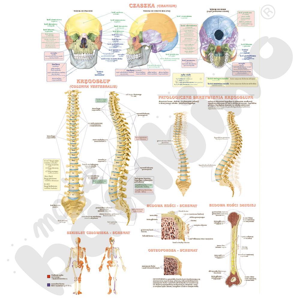 Wszystkie kości zostały opisane polskimi i łacińskimi nazwami, pokazano ich strukturę i przekrój, a także szczegółowo przedstawiono budowę czaszki, kręgosłupa, kości dłoni oraz stopy. Jest to doskonałe uzupełnienie lekcji biologii oraz alternatywa dla znacznie droższych fantomów i modeli.