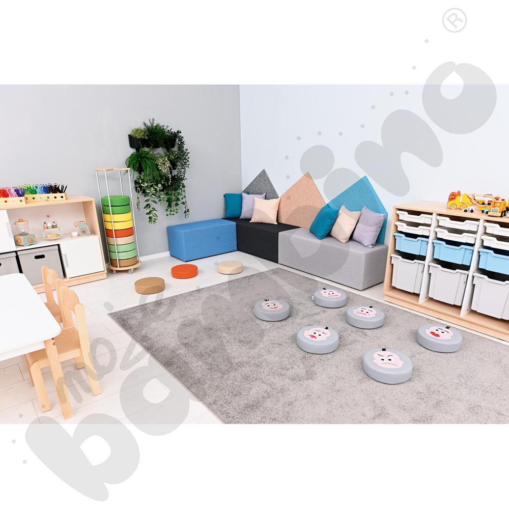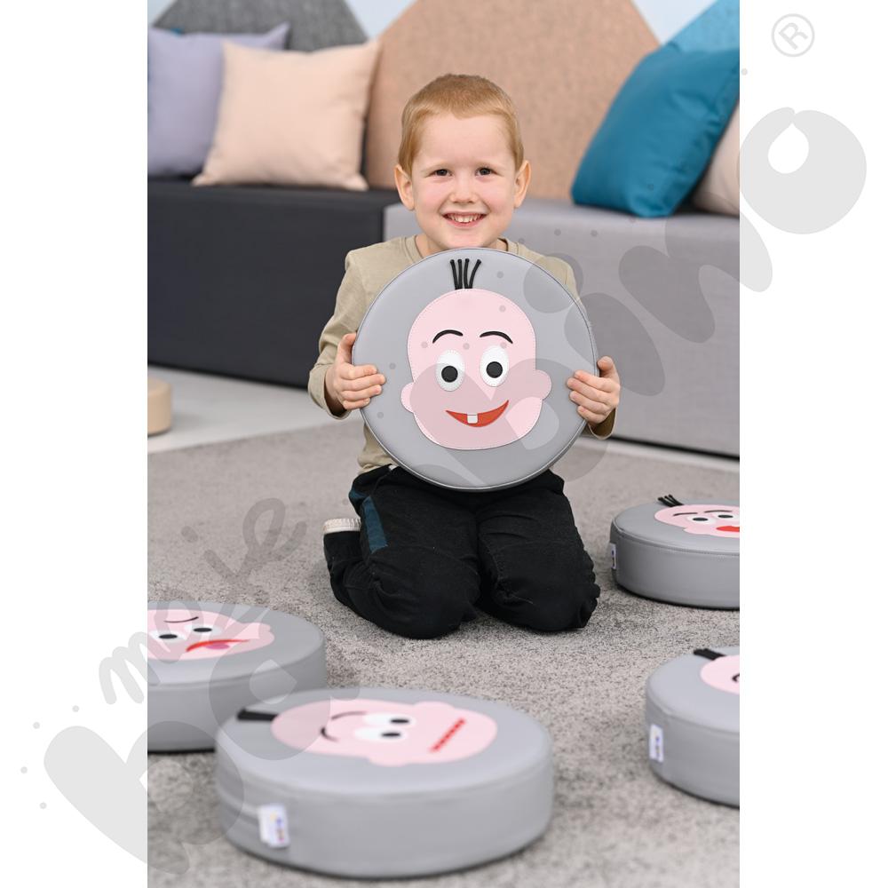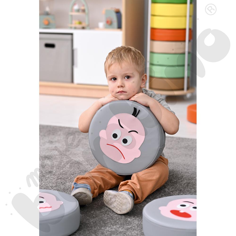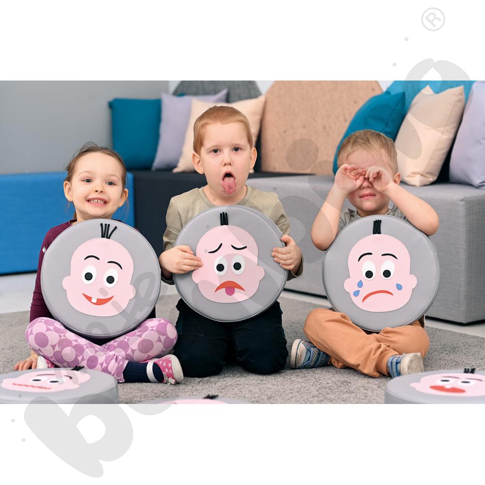 Zestaw pufek przedstawiających 6 podstawowych emocji: radość, smutek, strach, złość, zdziwienie i wstręt. Dzięki naśladowaniu naszytych na pufkach min, dzieci uczą się rozpoznawać i interpretować uczucia i nastroje innych. Doskonale sprawdzi się zarówno podczas zabaw jak i zajęć dydaktycznych. Wypełnione są pianką poliuretanową, a ich pokrowce są wykonane z trwałej, zmywalnej tkaniny wolnej od ftalanów.