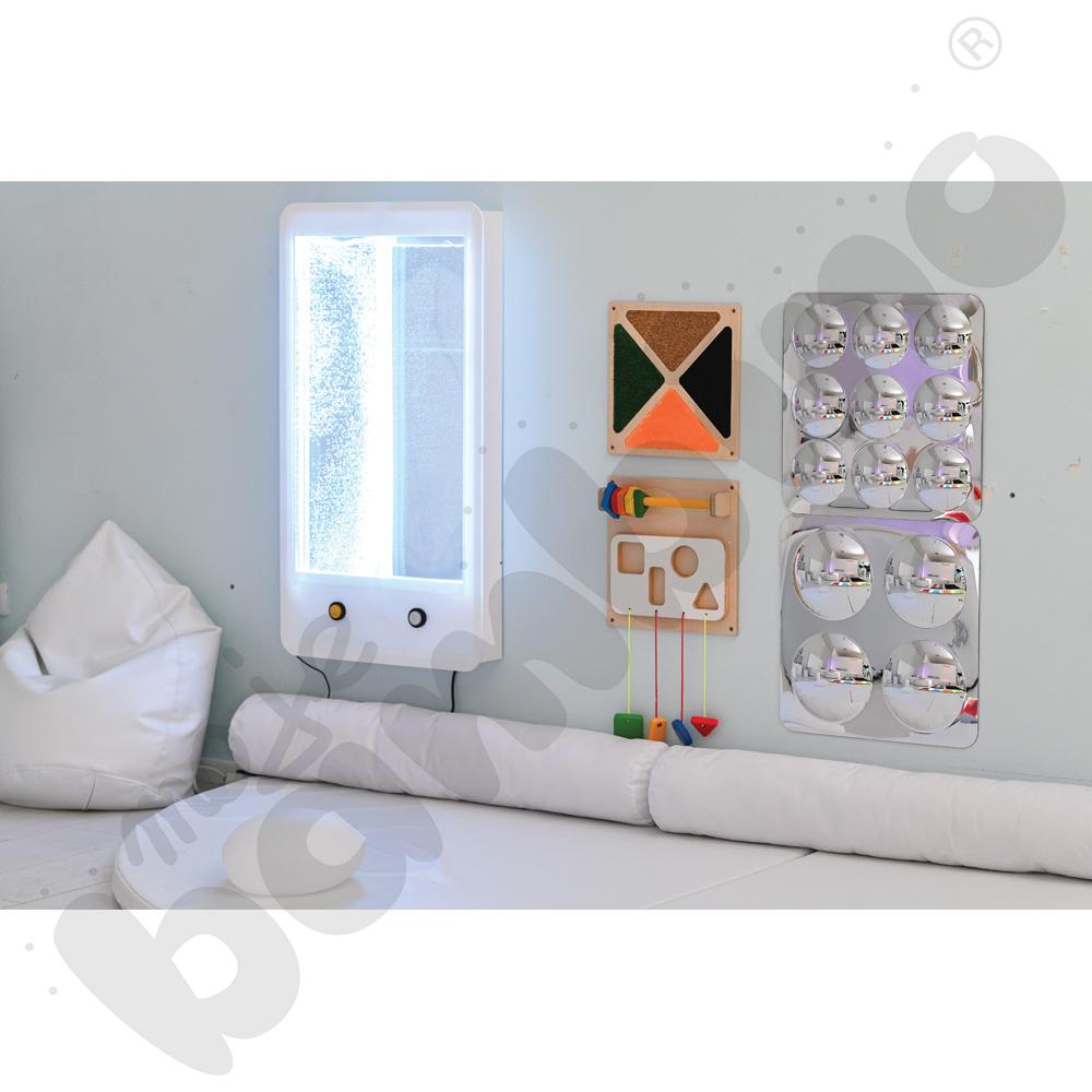 Panel ścienny z bąbelkami działa kojąco i relaksująco, pomagając obniżyć poziom stresu. Sprawdza się w pracy z dziećmi z ADHD, zaburzeniami integracji sensorycznej i autyzmem.