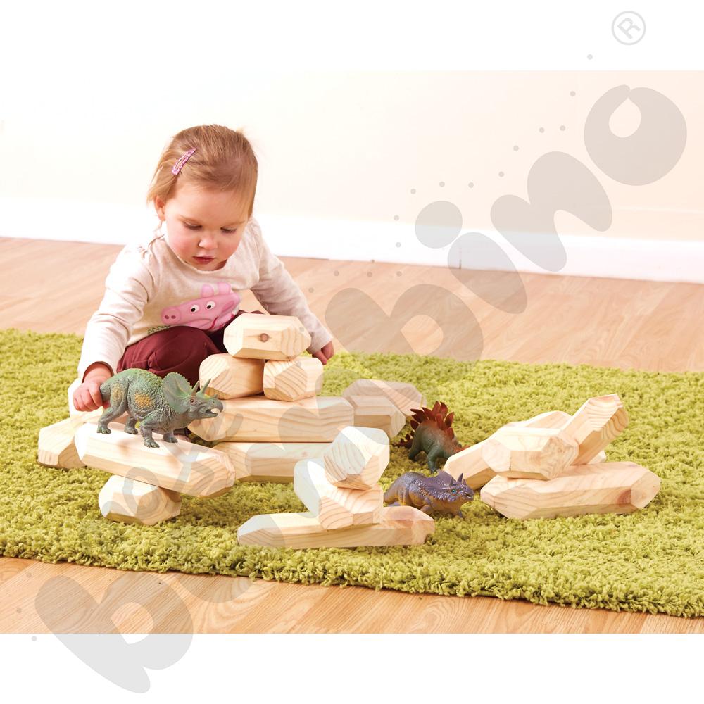 Zestaw drewnianych kamieni wykonanych z drewna sosnowego. Nadają się do budowania różnych budowli, wspierając rozwój umiejętności rozwiązywania problemów oraz opowiadania historii.