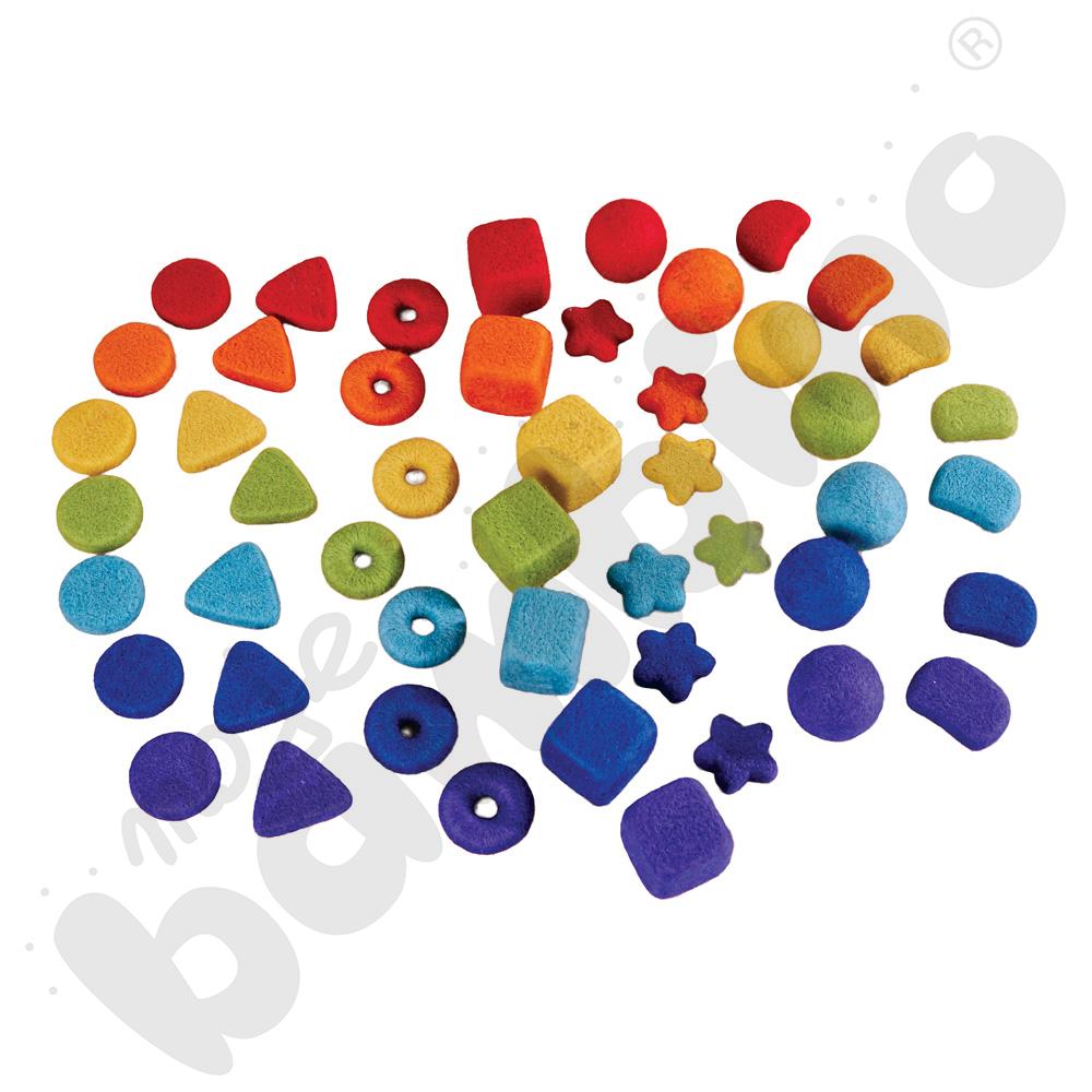 Zestaw filcowych kształtów. Wspierają rozwój umiejętności motorycznych, kreatywności. Mogą być wykorzystywane w różnych obszarach nauczania, np. matematyka. Wykonane z filcu w siedmiu kolorach tęczy.
