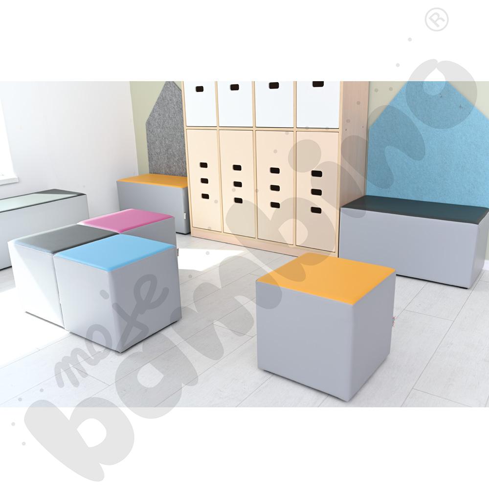 Praktyczne i wygodne siedziska o nowoczesnym kształcie i kolorach, do szatni lub na korytarz, dostępne w 3 rozmiarach. Stelaż zapewniający stabilność pokryty warstwą miękkiej pianki oraz trwałą tkaniną, niezawierającą ftalanów, łatwą do utrzymania w czystości.