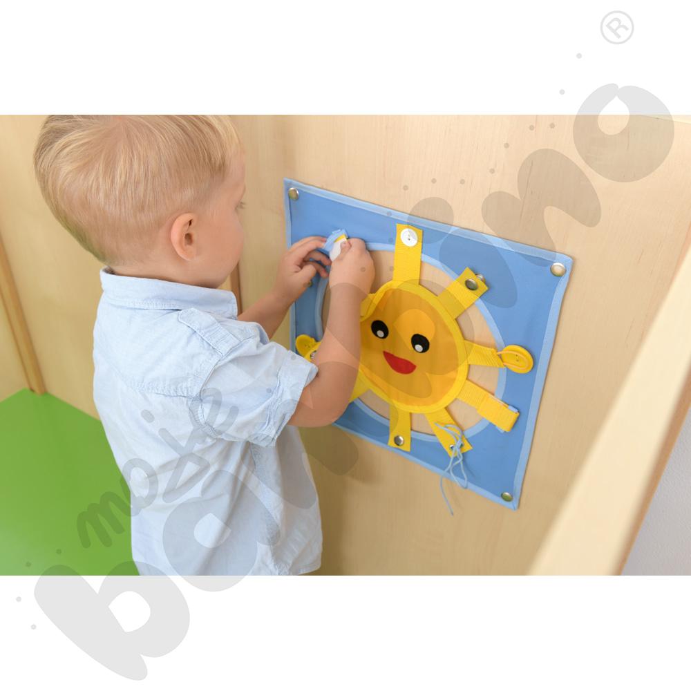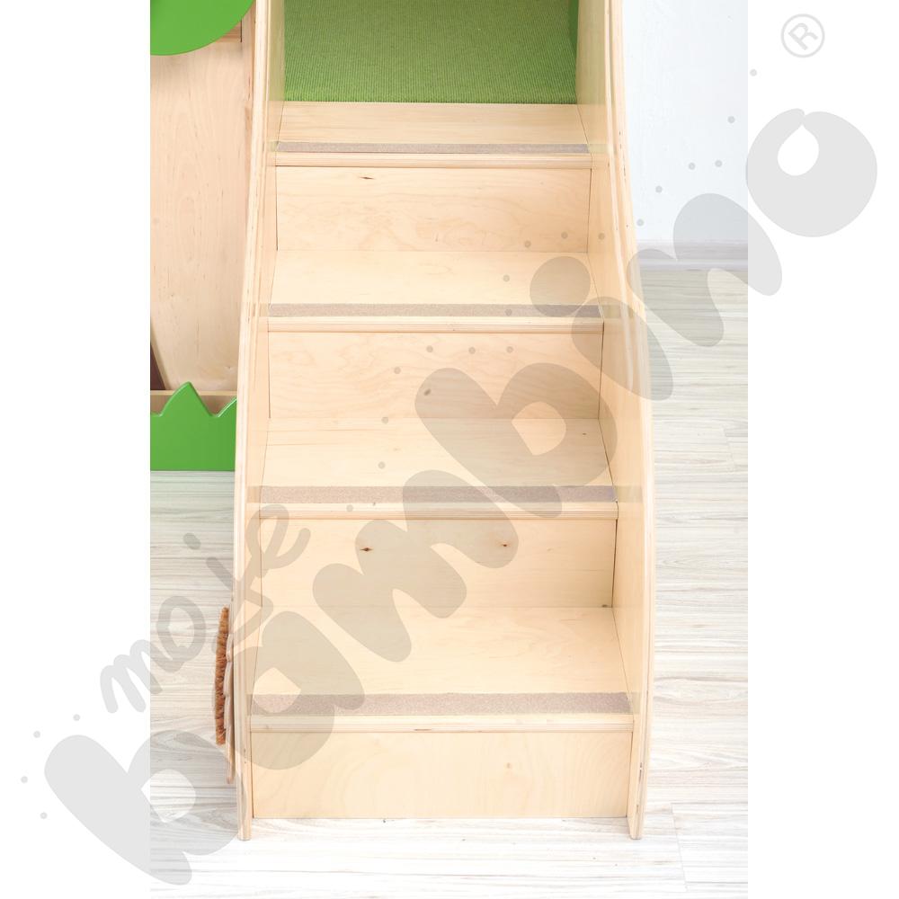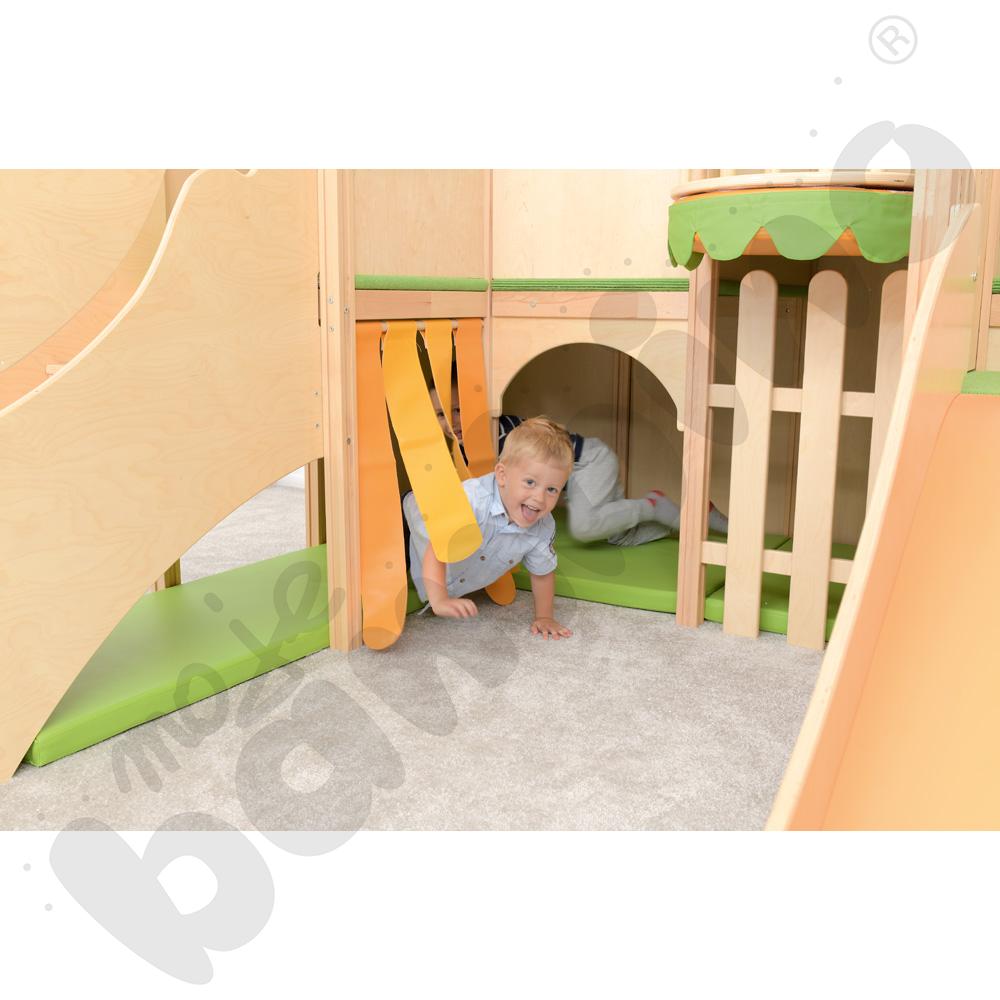 Kącik został wyposażony w wiele atrakcji, które zaciekawią najmłodszych i zapewnią wspaniałą zabawę wielu dzieciom jednocześnie. Mogą zjeżdżać ze zjeżdżalni i bawić się na miękkich materacach ukrytych w środku. Wykonany jest z lakierowanej sklejki o gr. 18 mm, kolorowej płyty MDF, płyty laminowanej i drewna, wyposażony w zjeżdżalnię, schody, materace i okienko z pleksi. Podesty są pokryte wykładziną. Na ściankach zostały zamontowane tabliczki manipulacyjne ze słoneczkiem (118262), konikiem (118204) i rybką (118208). W podeście przy zjeżdżalni znajduje się "okienko" umożliwiające zaglądanie do dolnego poziomu kącika. Do tej części, pod podestami, prowadzi kilka wejść, a podłoże jest wyściełane materacami. Konieczne kotwiczenie do podłoża. • wym. 225 x 273 x 183 cm • wys. podestów 59, 78, 94 cm • wym. schodów 47 x 117 x 60 cm • wym. zjeżdżalni 43 x 132 x 60 cm • wym. wejścia 50 x 67 cm • śr. okienka 40 cm • wym. materacy 108 x 75 cm (2 szt.), 130 x 50 cm (2 szt.) • wym. balkonu 55 x 127,5 cm • wym. podestu przy schodach 54,5 x 141 cm • wym. podestów przy zjeżdżalni 54,5 x 58,5 cm i 54,5 x 84 cm • wym. podestu przy balkonie 54,5 x 84 cm