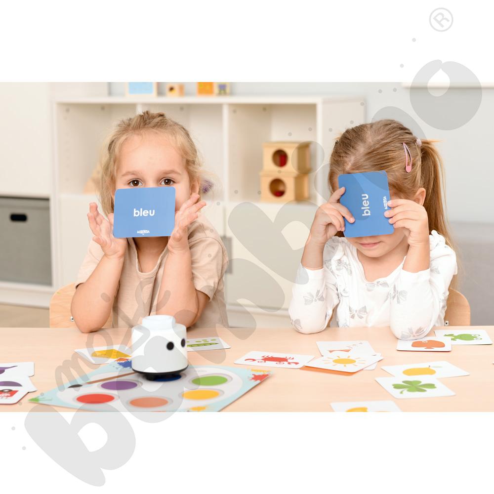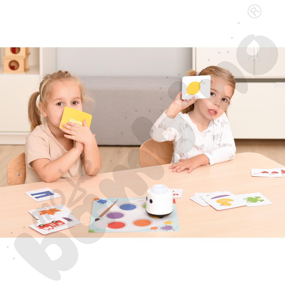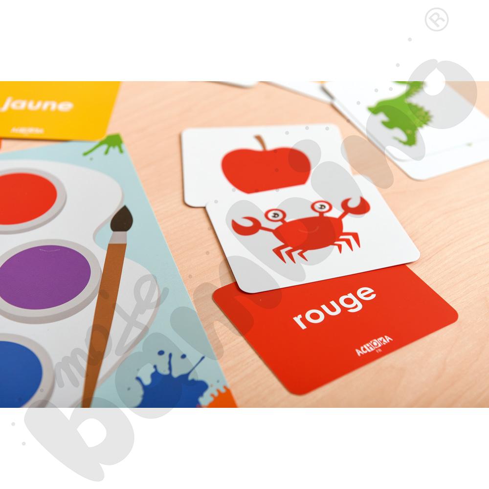 Zestaw składa się z kart przedstawiających kolorowy przedmiot wraz z jego nazwą w języku obcym. Dzieci w naturalny sposób uczą się rozpoznawania, nazywania i poprawnej wymowy kolorów w innym języku, a jednocześnie wzbogacają swoje słownictwo tematyczne.