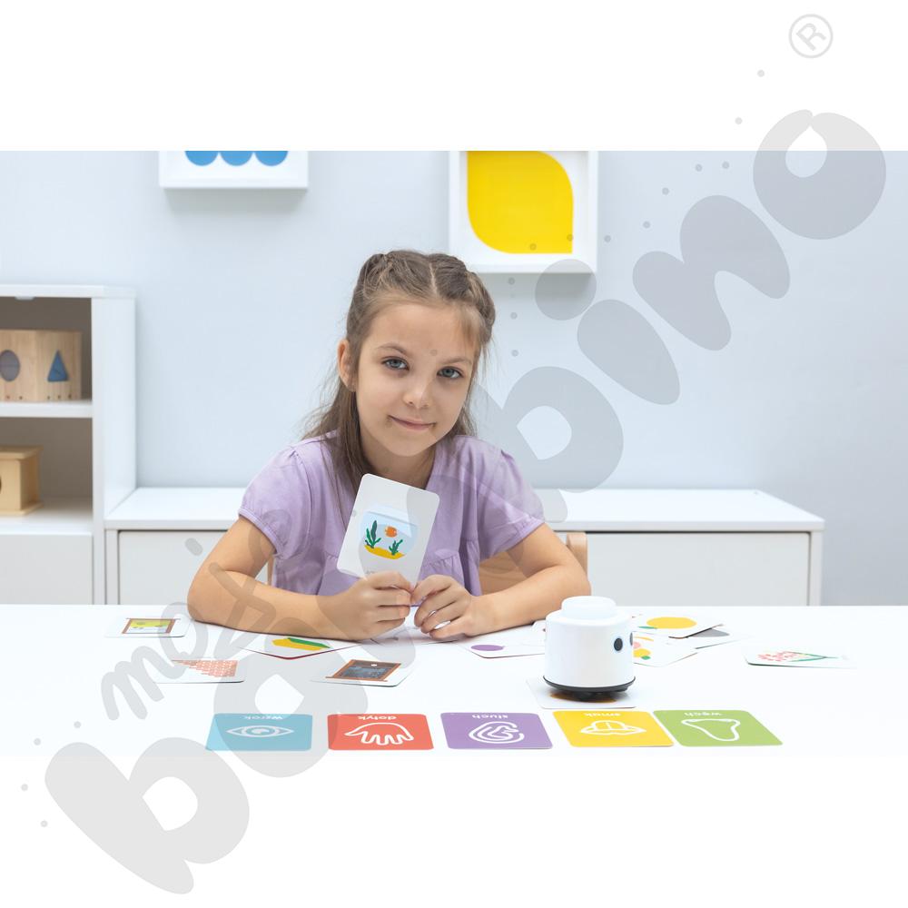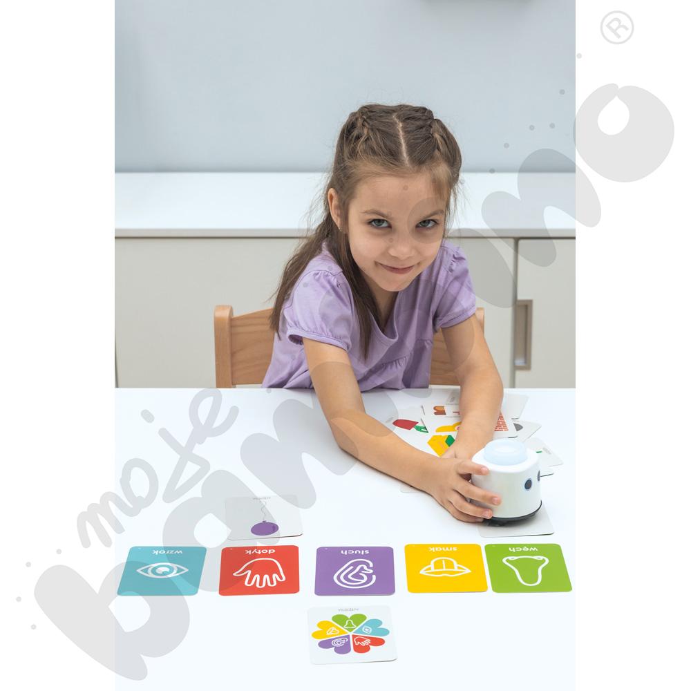 Dzięki kartom dzieci uczą się rozróżniać dotyk, smak, węch, wzrok i słuch oraz dopasowywać je do przedmiotów z codziennego życia. Kolorowe oznaczenia ułatwiają sortowanie i klasyfikowanie, a forma zabawy z LOGI miniBotem zachęca do aktywnego udziału i samodzielnego myślenia.