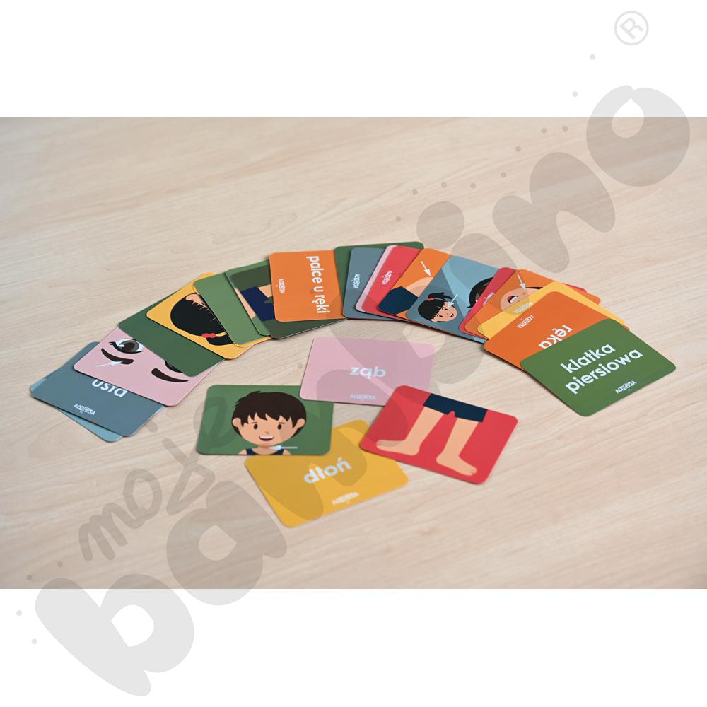 Gra wprowadza w podstawy wiedzy o ludzkim ciele w sposób przyjazny, wizualny i interaktywny. Dzięki pracy z kartami dziecko poznaje i utrwala nazwy poszczególnych części ciała, kojarzy je z ilustracją oraz zapisanym słowem. Nauka przebiega wielozmysłowo – poprzez oglądanie, słuchanie, mówienie i wskazywanie danego elementu na własnym ciele.