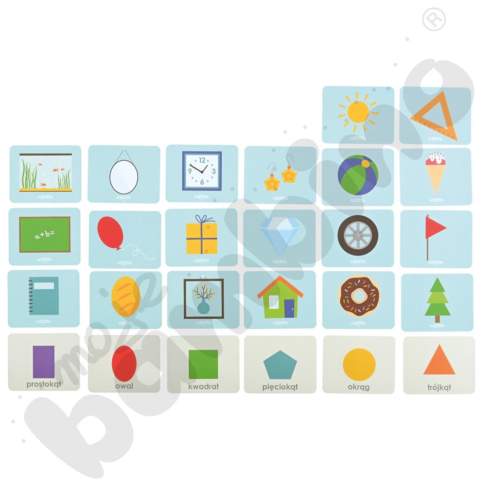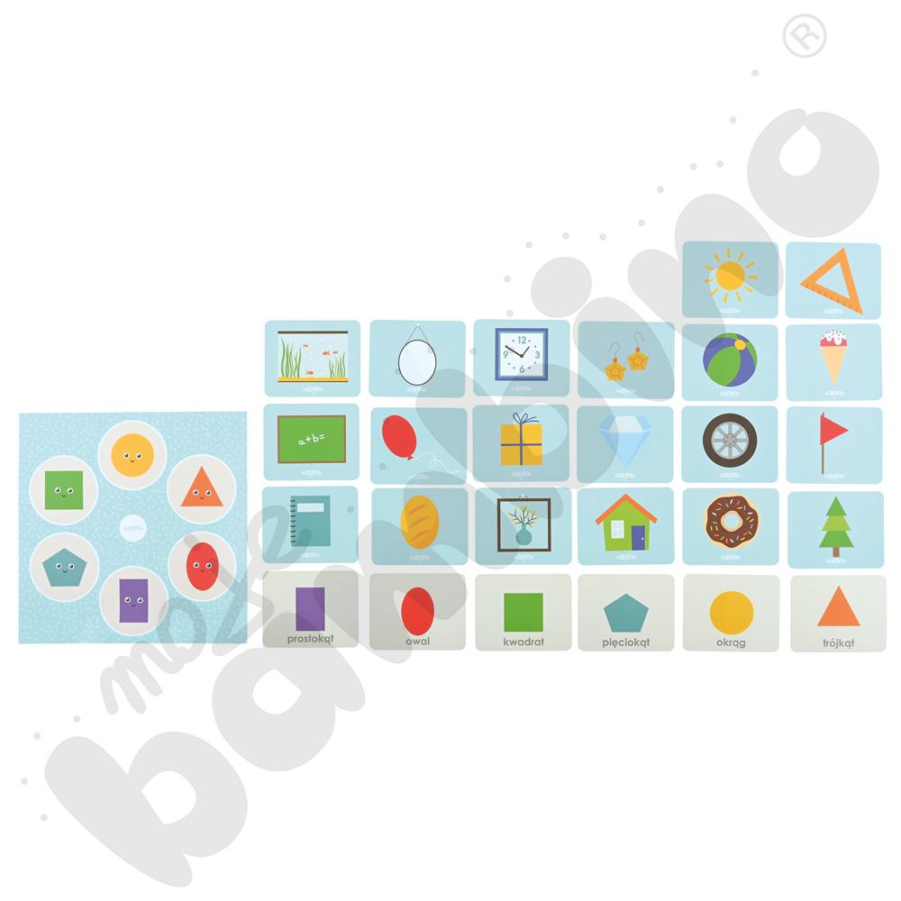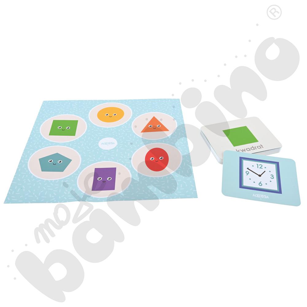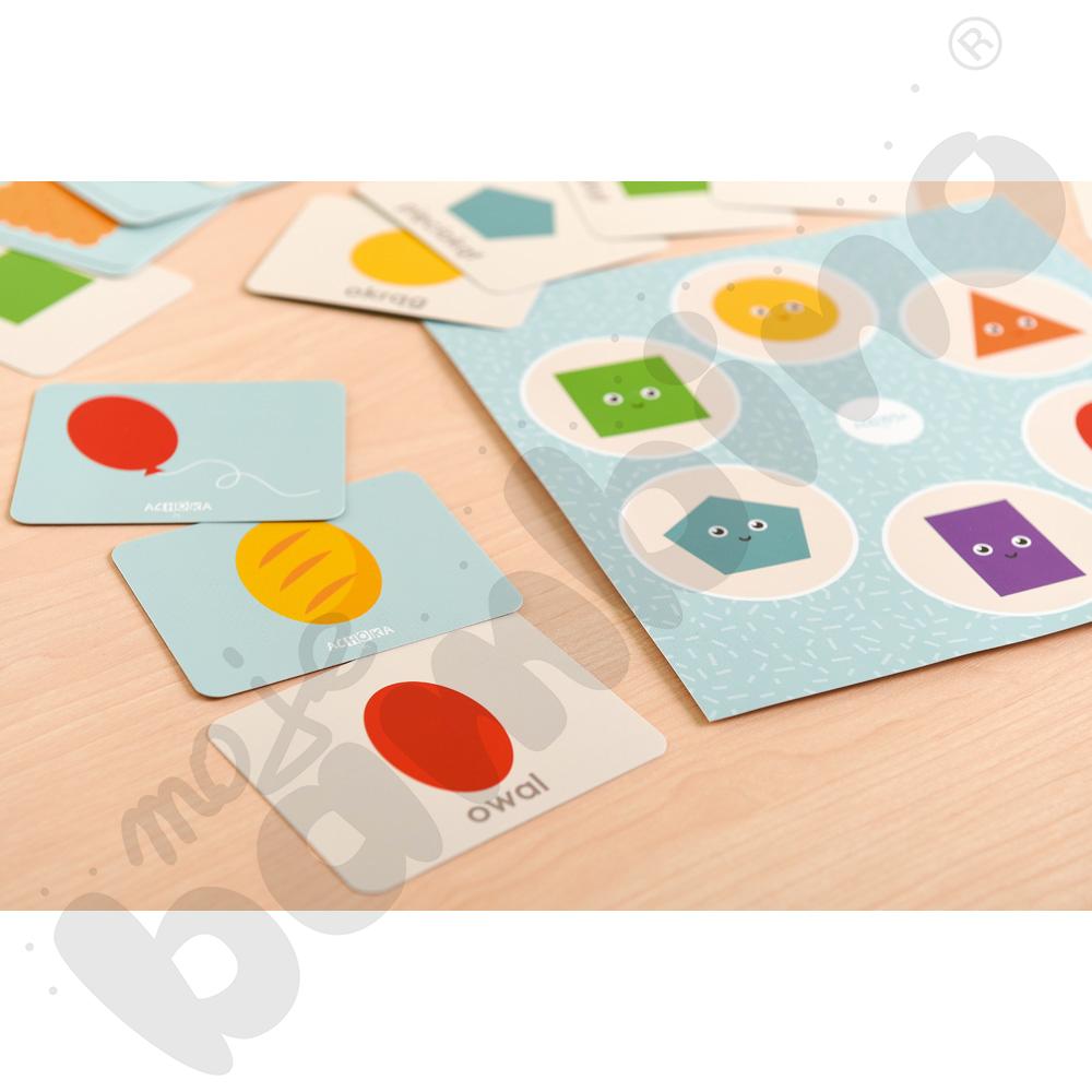 Zestaw oparty jest na metodzie samodzielnego sprawdzania odpowiedzi, co sprzyja budowaniu pewności siebie i rozwija umiejętność samokontroli. Możliwość pracy z dwóch stron kart (figura/przedmiot) pozwala wprowadzać coraz trudniejsze zadania i stopniowo podnosić poziom trudności.