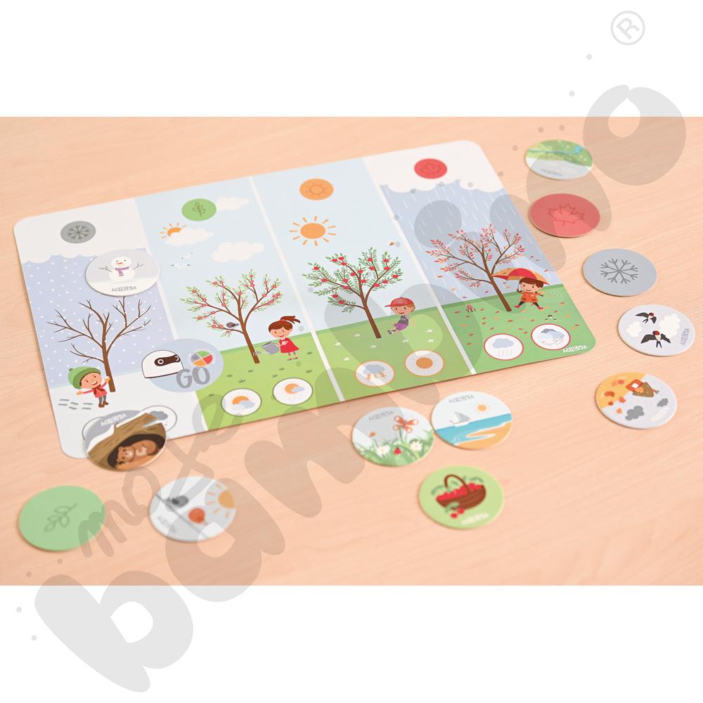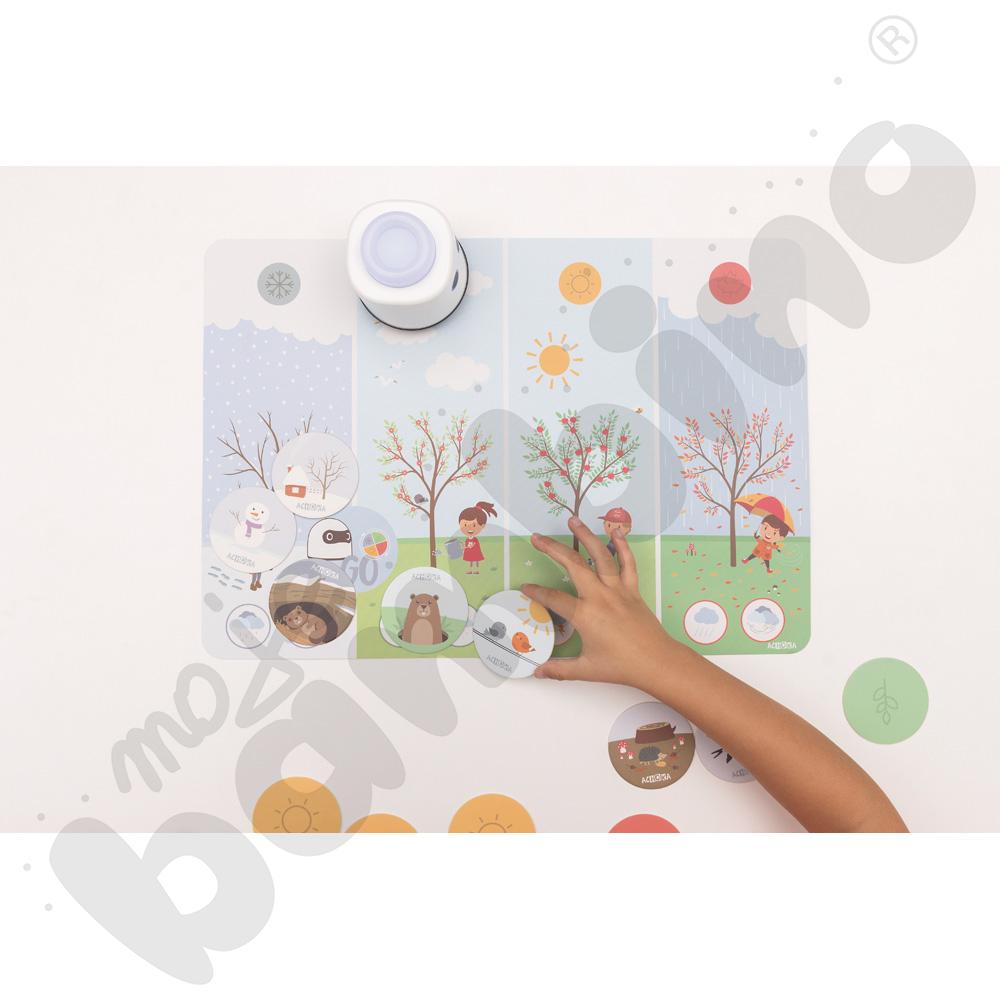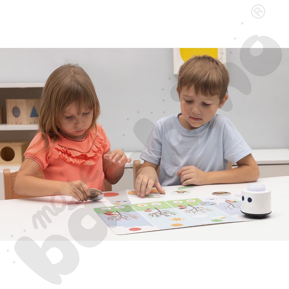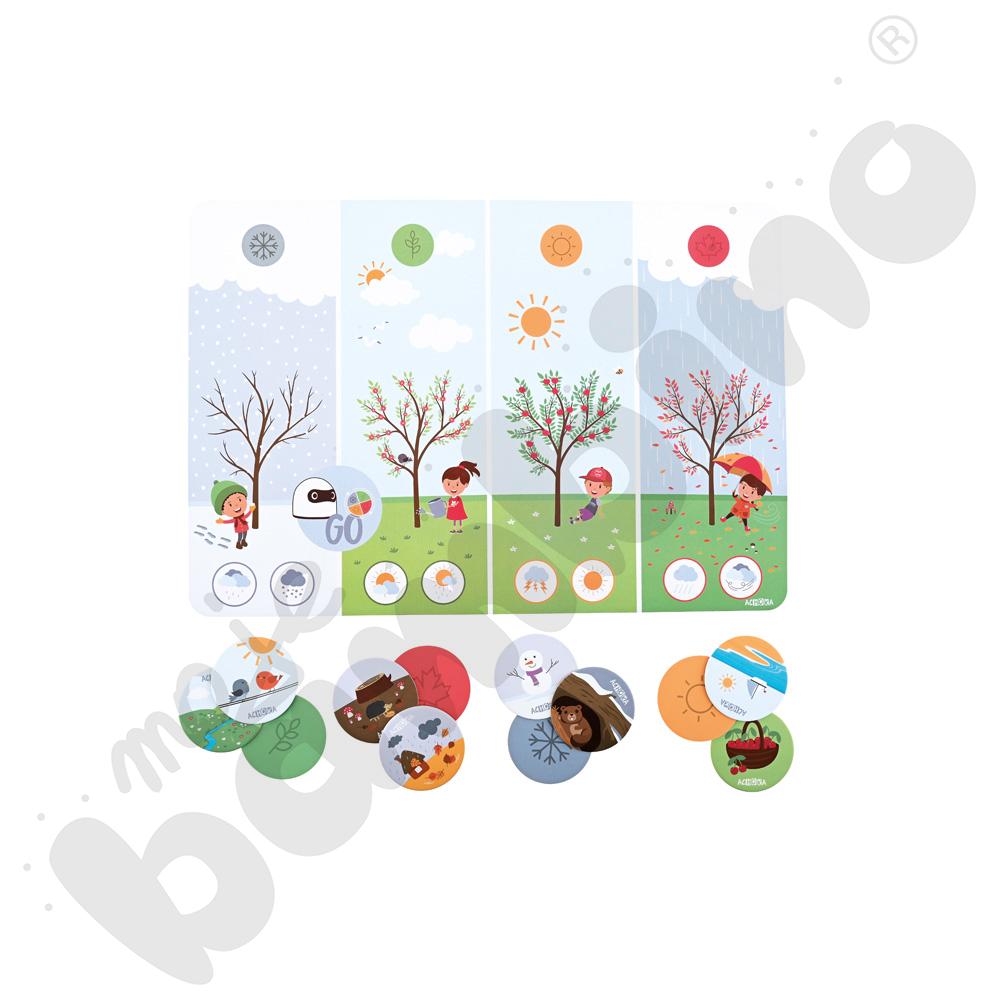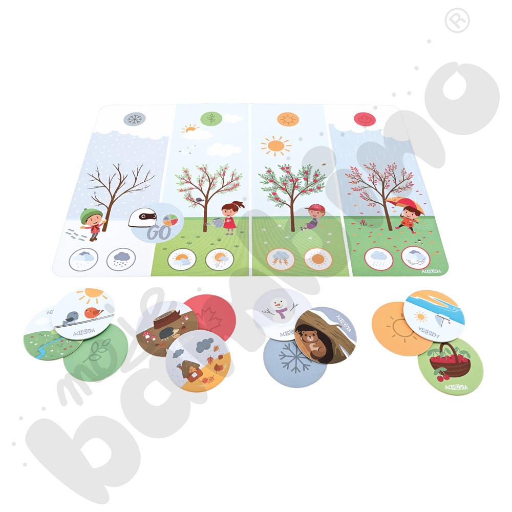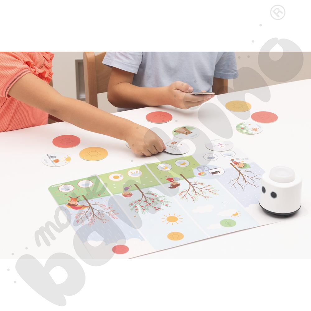 Zestaw przybliża dzieciom cykl przyrody oraz zmieniające się zjawiska w otaczającym świecie. Dzięki planszy, kartom i nagraniu audio, najmłodsi uczestnicy mają okazję samodzielnie odkrywać różnice między zimą, wiosną, latem i jesienią – zarówno wizualnie, jak i dźwiękowo. Podczas zabawy dzieci nazywają zjawiska pogodowe, rośliny i zwierzęta charakterystyczne dla danej pory roku, rozwijając przy tym słownictwo i wiedzę przyrodniczą.