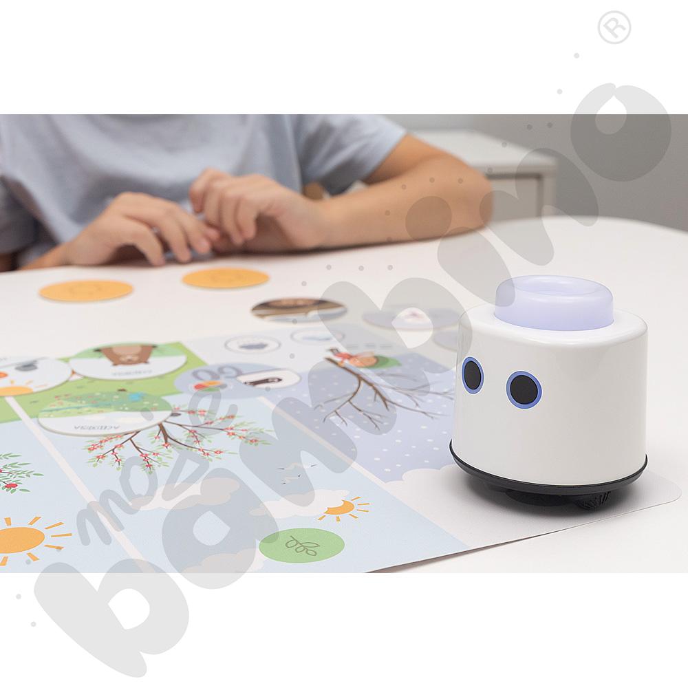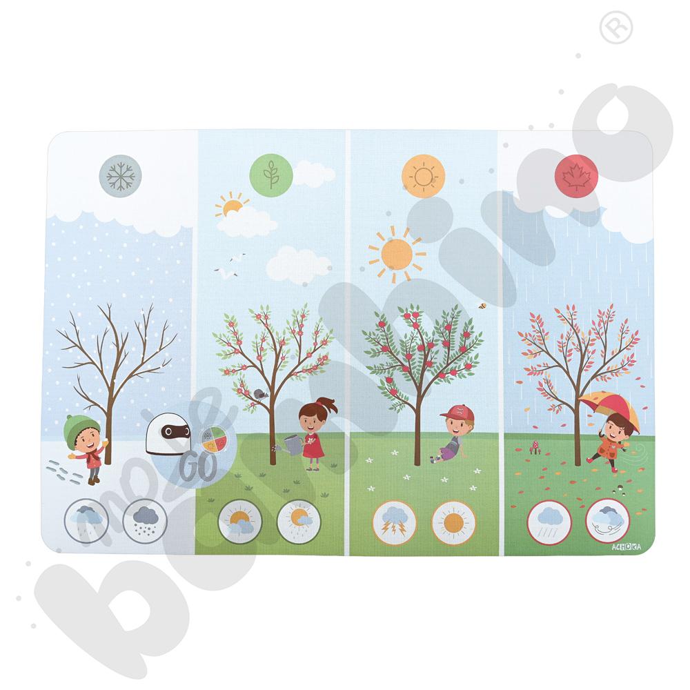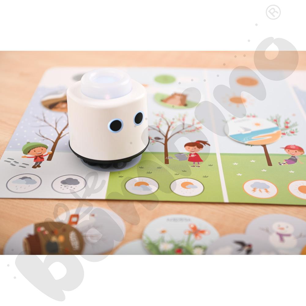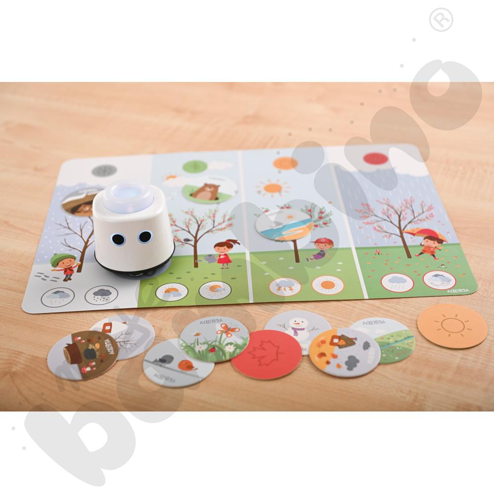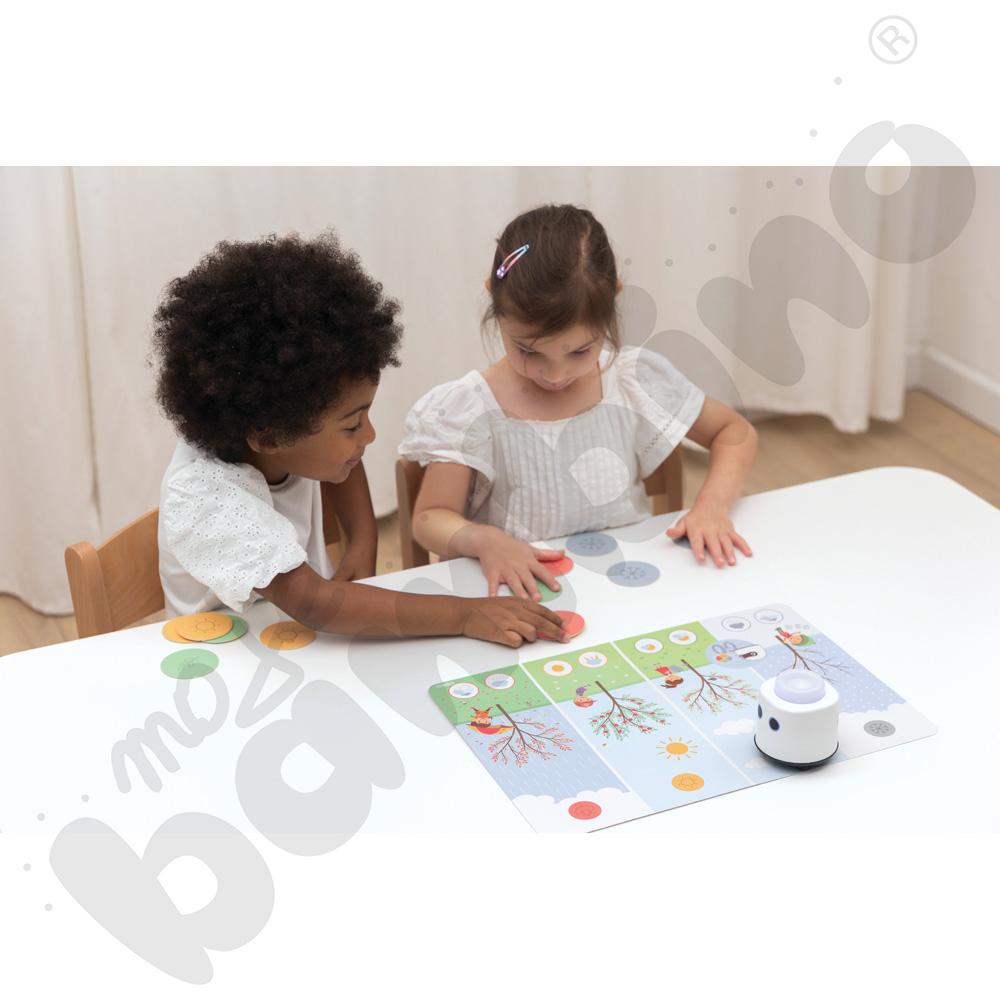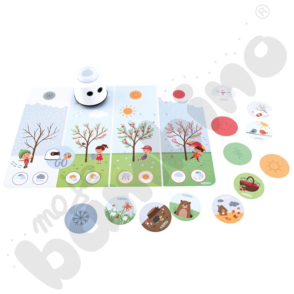 Zestaw przybliża dzieciom cykl przyrody oraz zmieniające się zjawiska w otaczającym świecie. Dzięki planszy, kartom i nagraniu audio, najmłodsi uczestnicy mają okazję samodzielnie odkrywać różnice między zimą, wiosną, latem i jesienią – zarówno wizualnie, jak i dźwiękowo. Podczas zabawy dzieci nazywają zjawiska pogodowe, rośliny i zwierzęta charakterystyczne dla danej pory roku, rozwijając przy tym słownictwo i wiedzę przyrodniczą.