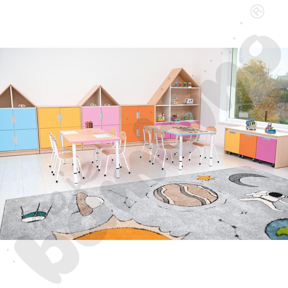 Blaty stołów wykonane z płyty laminowanej o gr. 18 mm w tonacji klonu jasnego lub białej. Narożniki łagodnie zaokrąglone i wykończone kolorowym obrzeżem ABS o gr. 2 mm. Stoły dostępne z blatami w 4 kształtach: kwadratowym, prostokątnym, okrągłym i sześciokątnym i 10 kolorach: białym, szarym, limonkowym, żółtym, jasnoróżowym, beżowym, łososiowym, oliwkowym, musztardowym i klonie jasnym. Nogi w 8 kolorach (133357-133360, 133600-133611, sprzedawane osobno).
