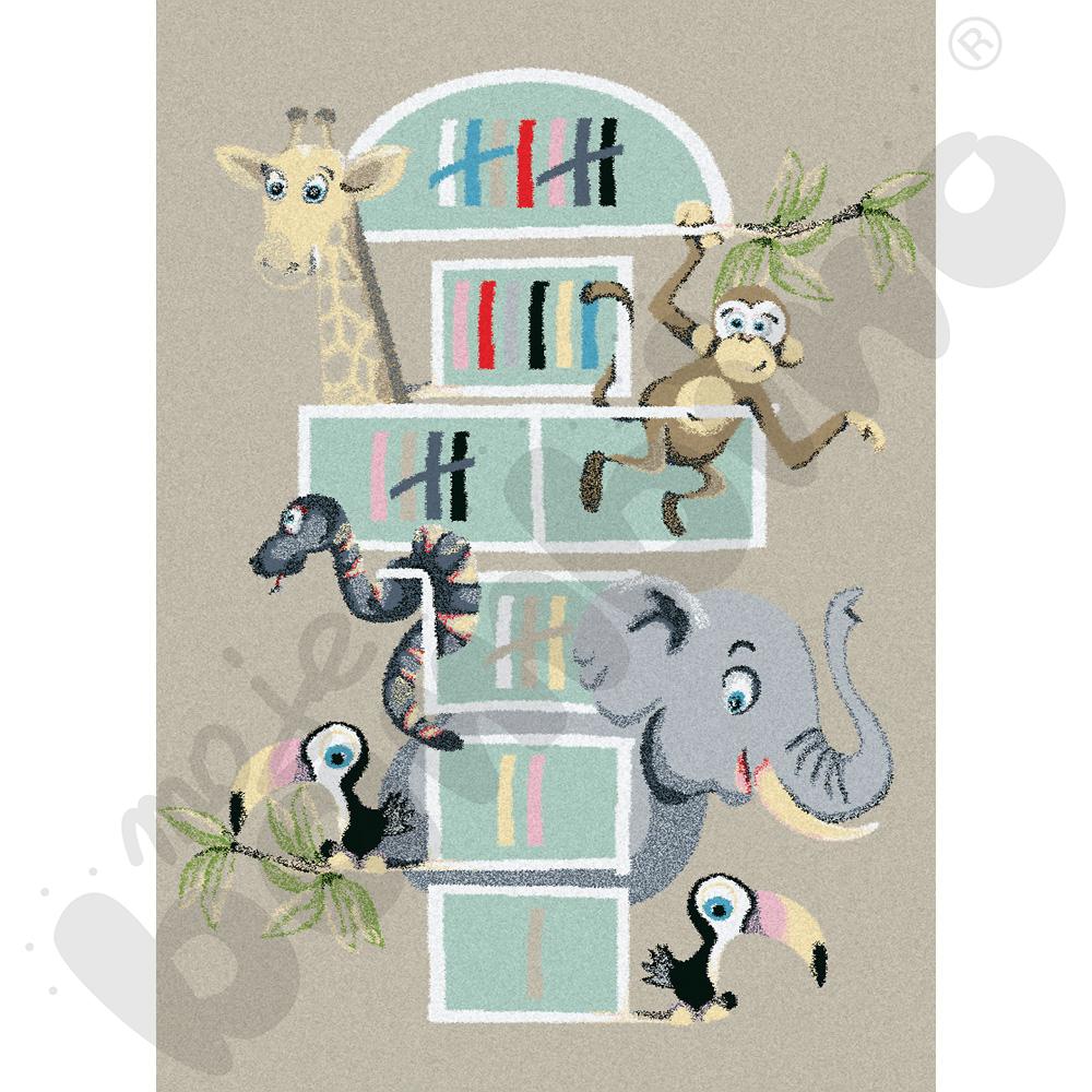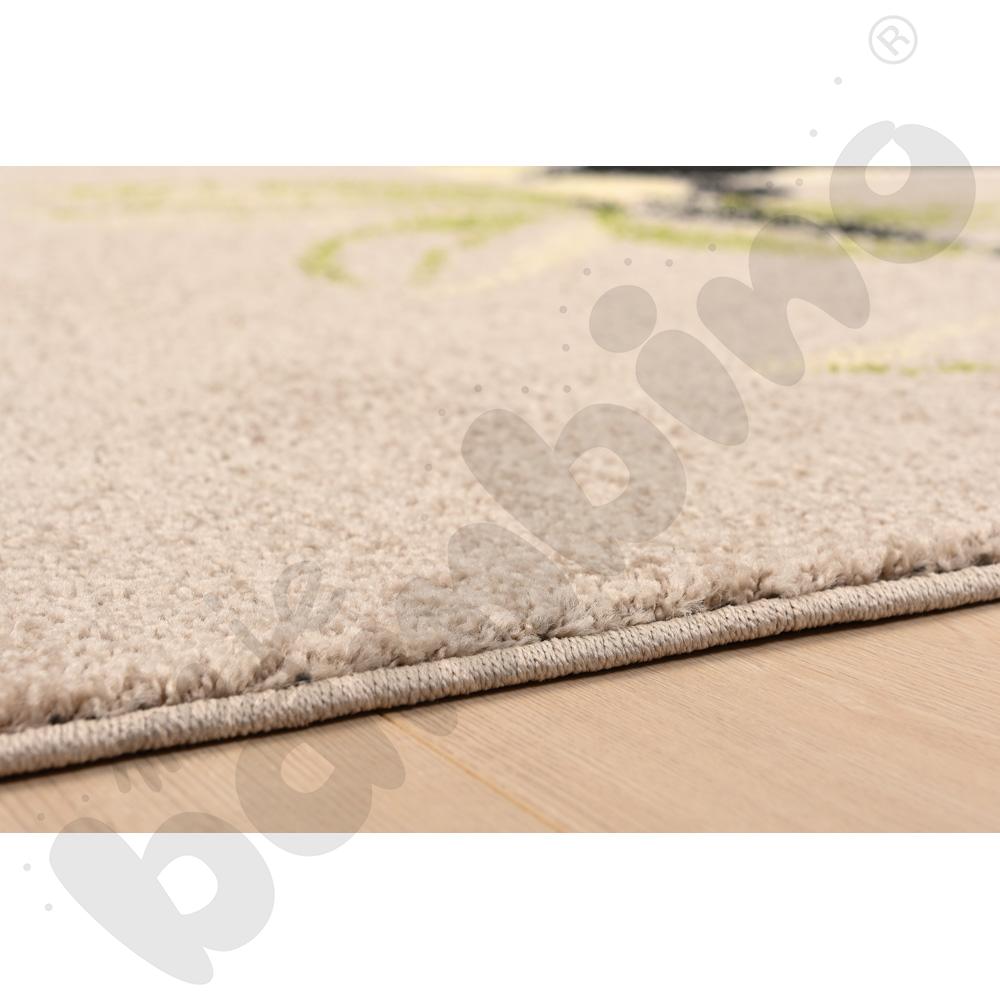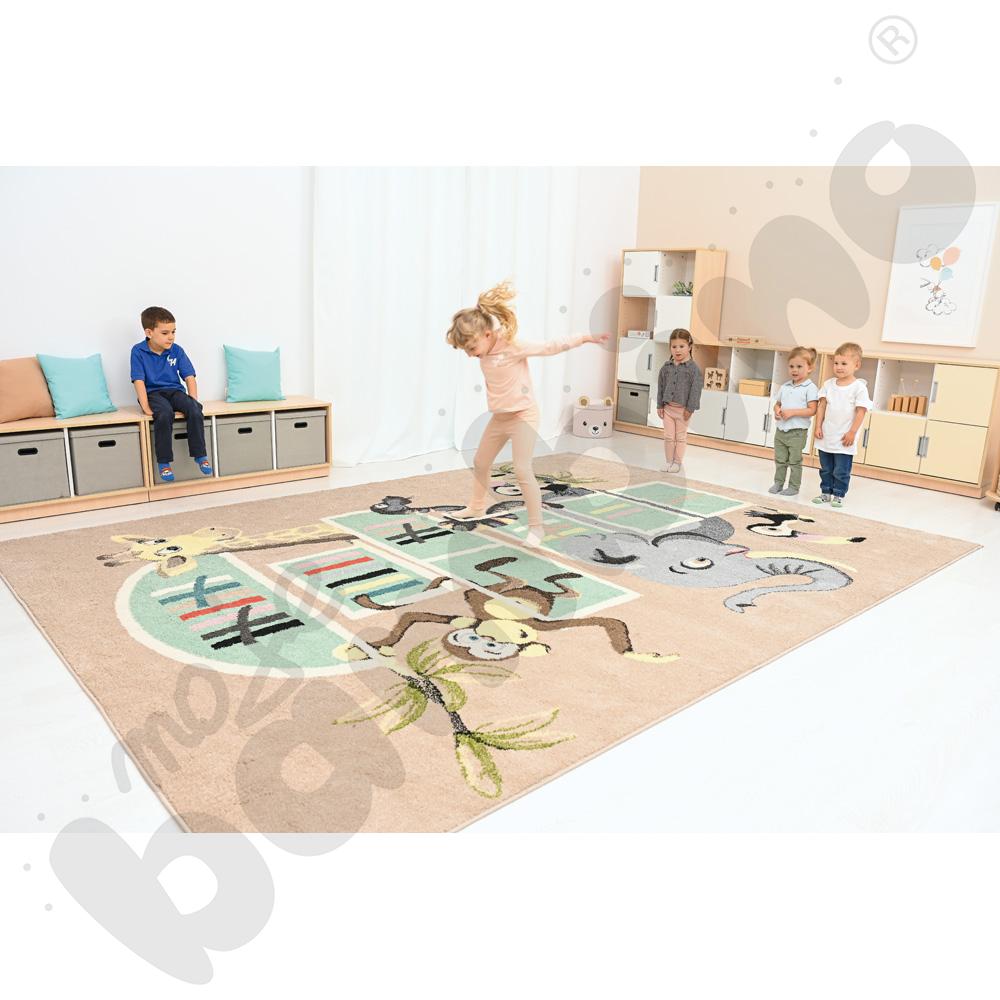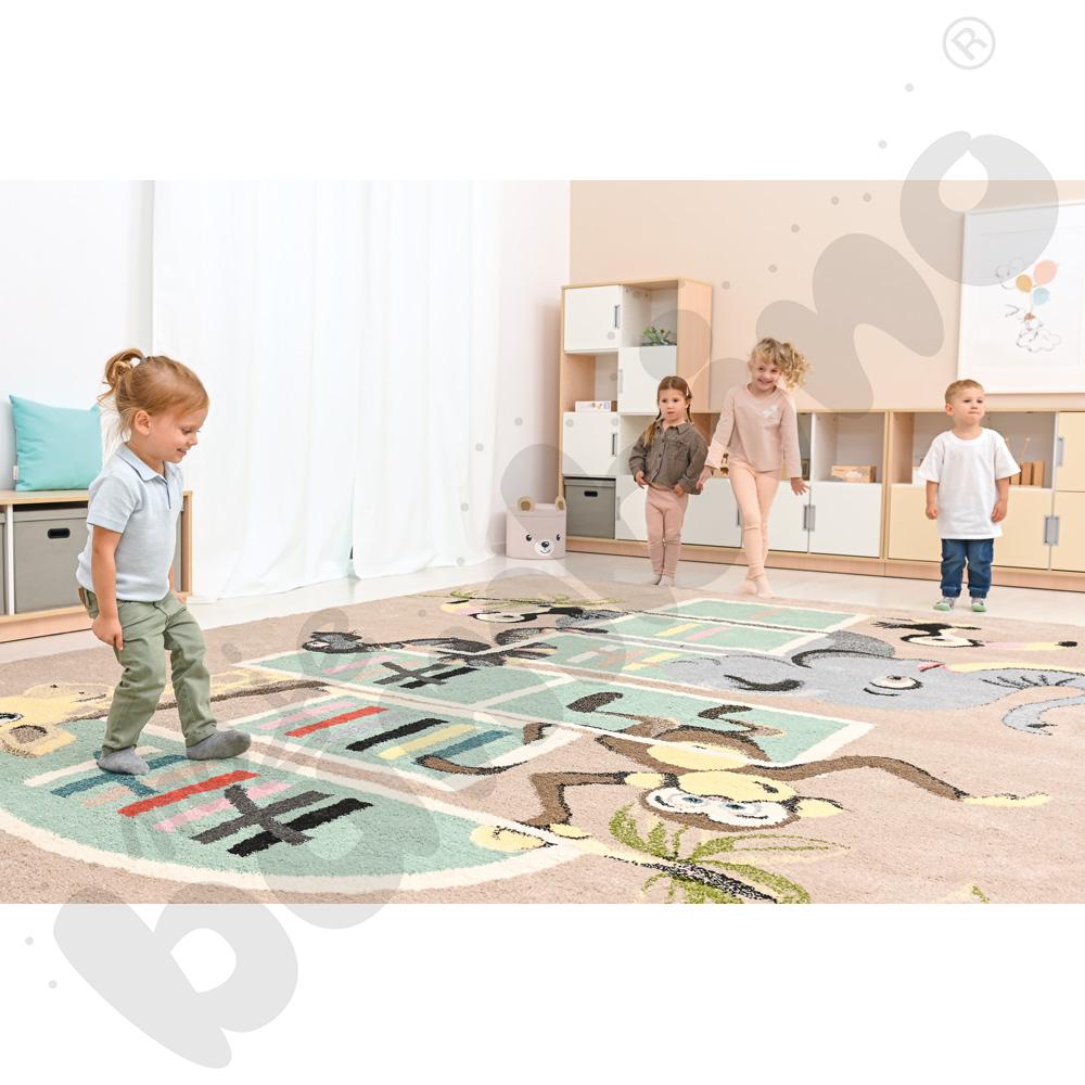 Na dywanie z nadrukiem wesołych zwierzaków można nie tylko wypoczywać i bawić się, ale także grać w klasy. Przędza syntetyczna, termicznie stabilizowana, z efektem typu frise. Technologia Wilton (tkany maszynowo). Posiada atest higieniczny PZH. Wysokość runa ok. 8 mm.