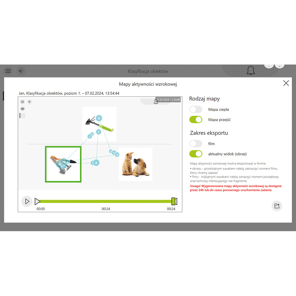 • tworzenie map aktywności wzrokowej użytkownika podczas pracy z urządzeniem (mapy ciepła – heat maps, mapy przejść – gaze plots)
