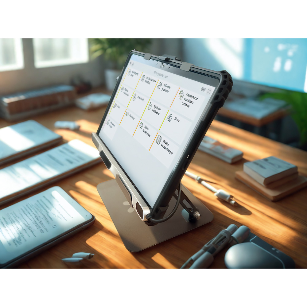 eyeTAB PRO to innowacyjne rozwiązanie łączące funkcjonalność systemu C-Eye X PRO z mobilnością i prostotą obsługi charakterystyczną dla neuroTAB-a. Urządzenie ma postać tabletu z wbudowanym eye trackerem, zintegrowanego ze stabilną podstawką, umożliwiającą zarówno pracę stacjonarną w gabinecie, klasie, jak i mobilne wykorzystanie w terenie.