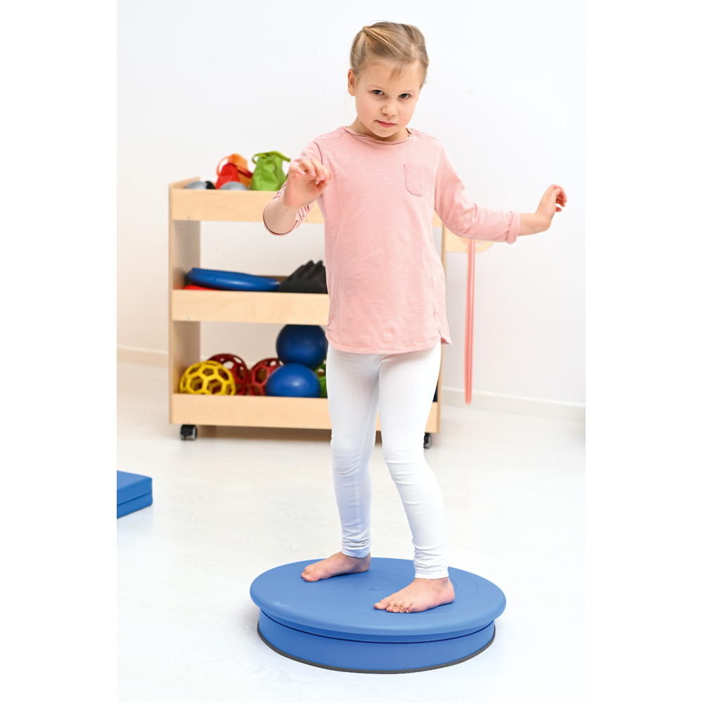 Wytrzymała, obrotowa platforma przeznaczona do rozwijania równowagi, koordynacji i świadomości ciała u dzieci. Wykonana z solidnego tworzywa sztucznego, posiada lekko pochyloną powierzchnię, dzięki której dziecko może kontrolować prędkość i kierunek obrotu poprzez zmianę pozycji ciała. Gumowe obrzeże antypoślizgowe zapewnia stabilność, a mechanizm z pięcioma łożyskami kulkowymi gwarantuje płynny i bezpieczny ruch.