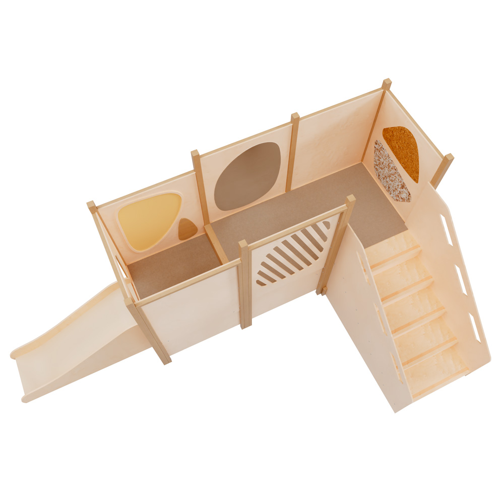 Modułowa platforma zabaw ModuPlay pozwala samodzielnie stworzyć i rozbudowywać wewnętrzną strefę aktywności dla dzieci. System składa się z podestów oraz elementów zabawowych i ściennych, które można dowolnie zestawiać – od niewielkiego kącika do raczkowania po większą konstrukcję do wspinania, zjeżdżania, zabaw ruchowych i sensorycznych.