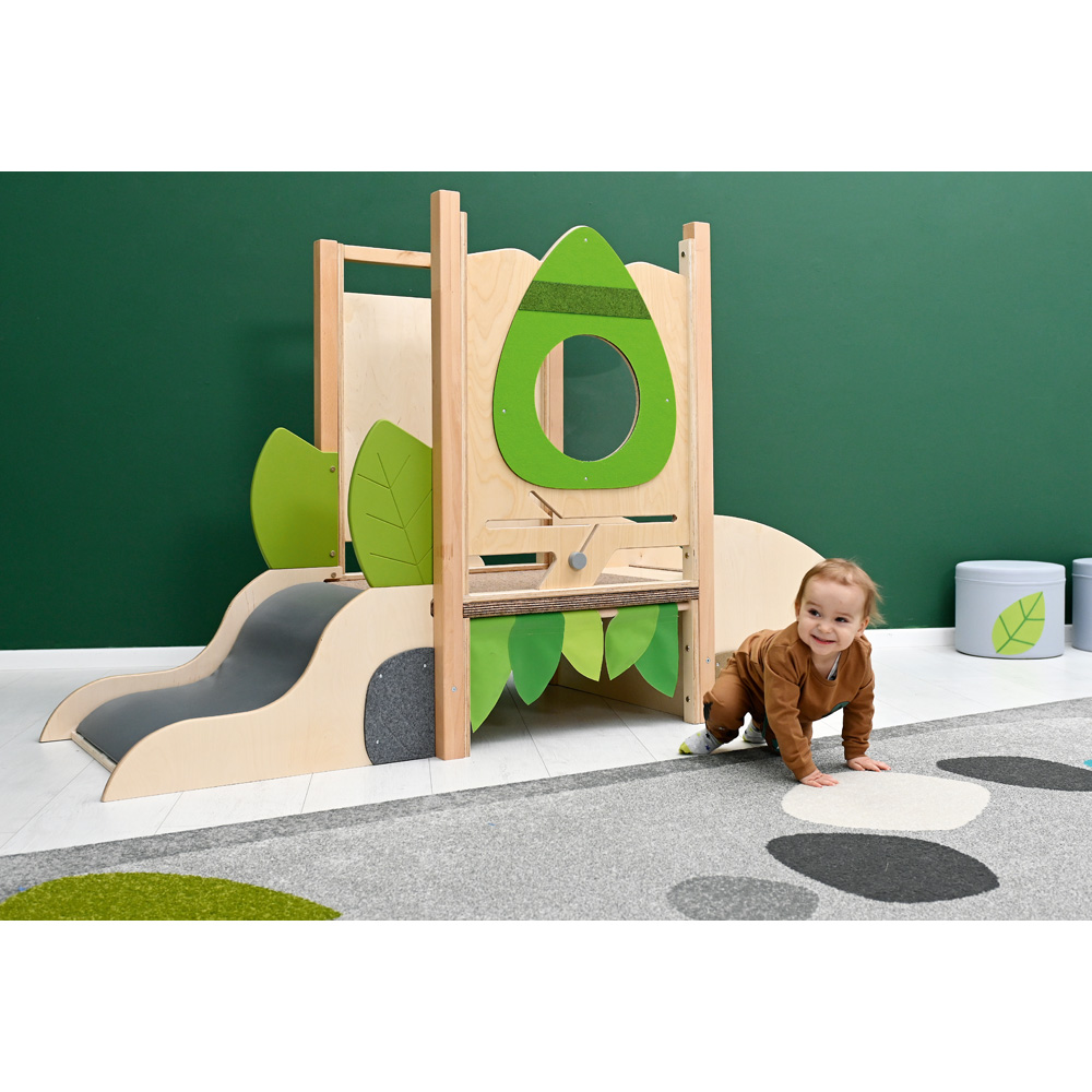 Mini kącik wykonany ze sklejki lakierowanej (gr. 18 mm), płyty laminowanej i drewna, wyposażony w schody, zjeżdżalnię, okienko z pleksi oraz przesuwankę na ściance pod oknem. Podest pokryty wykładziną. • wys. podestu 35 cm • wym. schodów 66 x 110 x 35 cm • wym. zjeżdżalni 66 x 122 x 35 cm