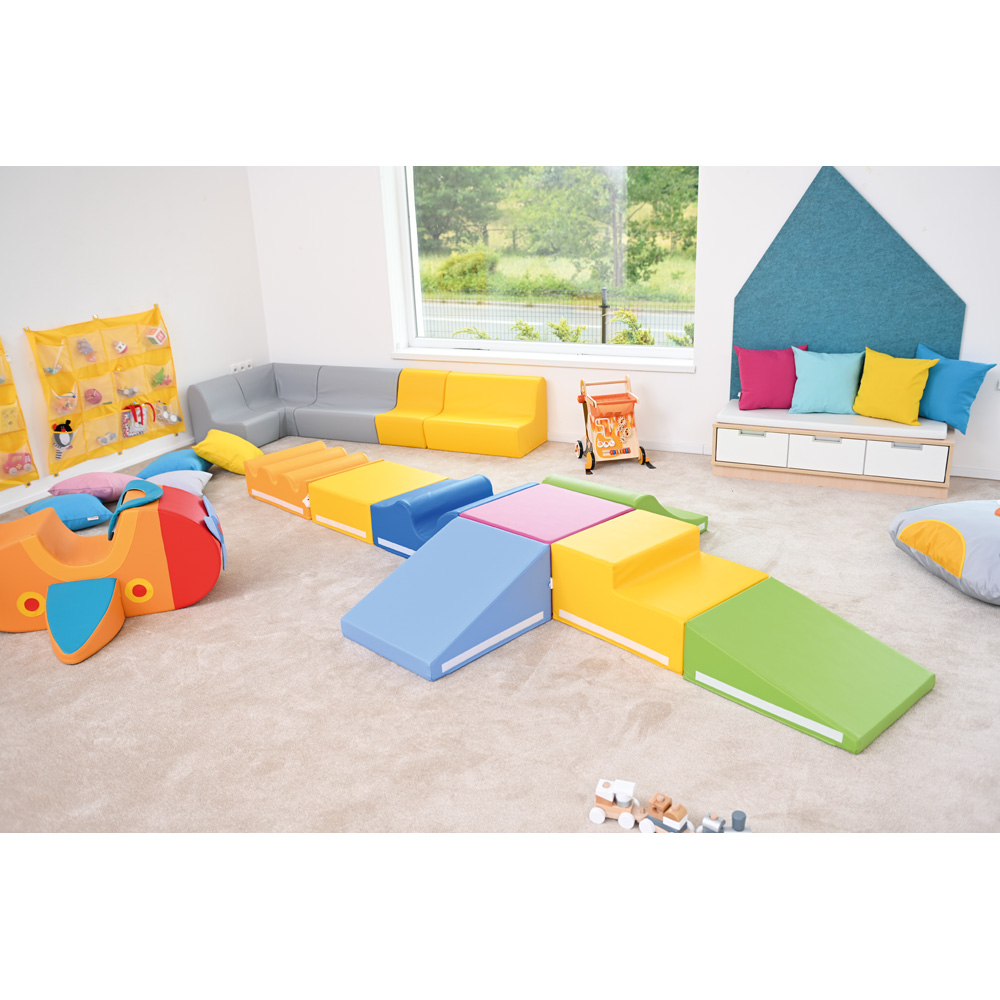 Zestaw pianek składający się z 8 części. Elementy tworzą tor przeszkód dla maluchów, które zaczynają ćwiczyć i rozwijać swoją koordynację ruchową. oraz 60 x 50 x 30 cm