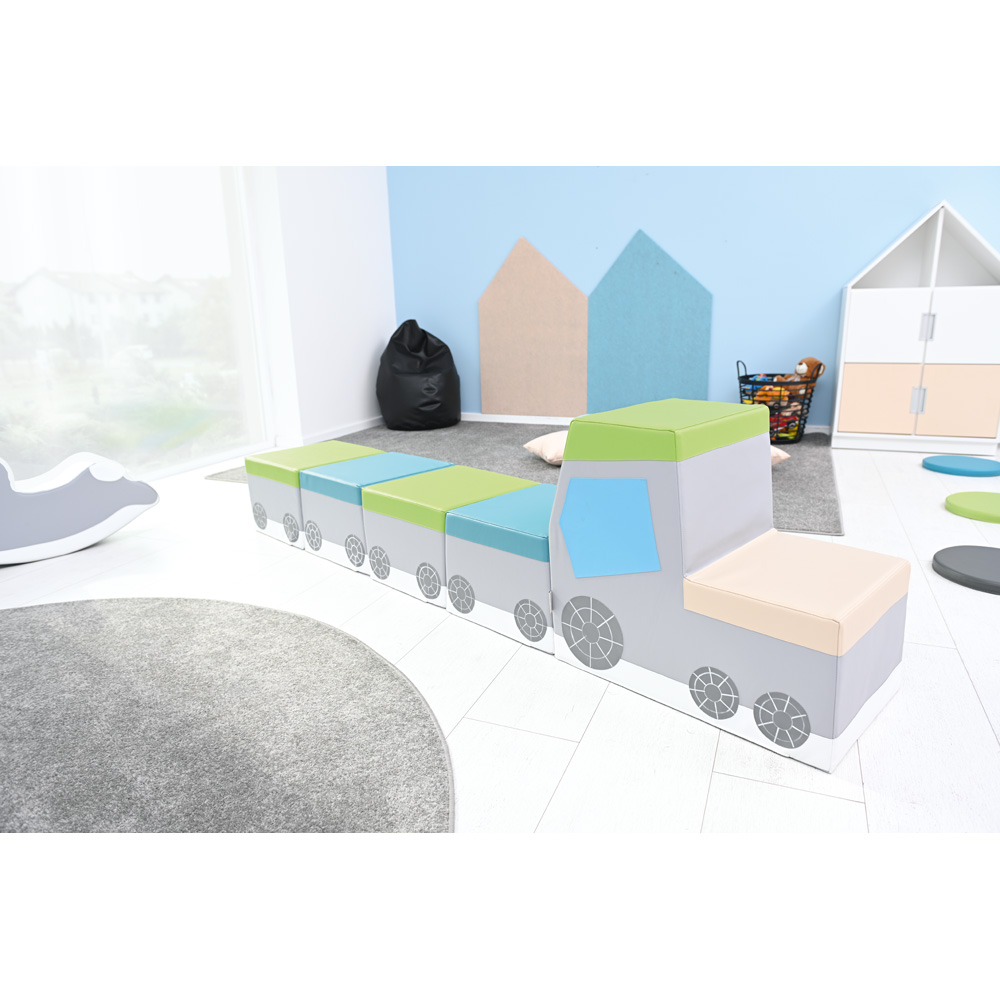 Składa się z 4 puf-wagoników i lokomotywy. Elementy obszyte trwałą tkaniną, niezawierającą ftalanów, łatwą do utrzymania w czystości.