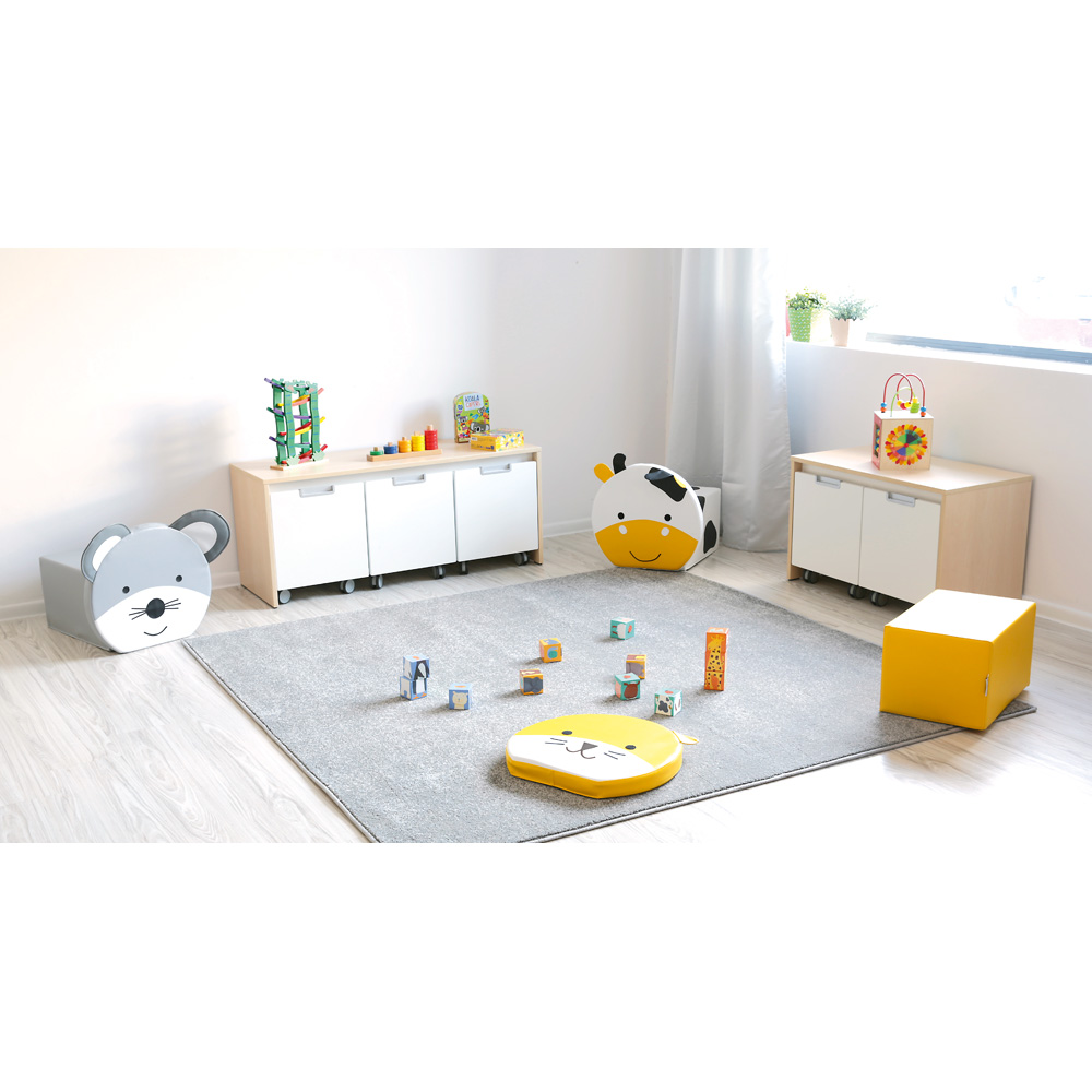 Miękkie pufy-zwierzątka w wesołych kolorach, wykonane z pianki, z pokrowcem z trwałej tkaniny, niezawierającej ftalanów, łatwej do utrzymania w czystości. • wym. siedziska 30 x 50 x 26 cm