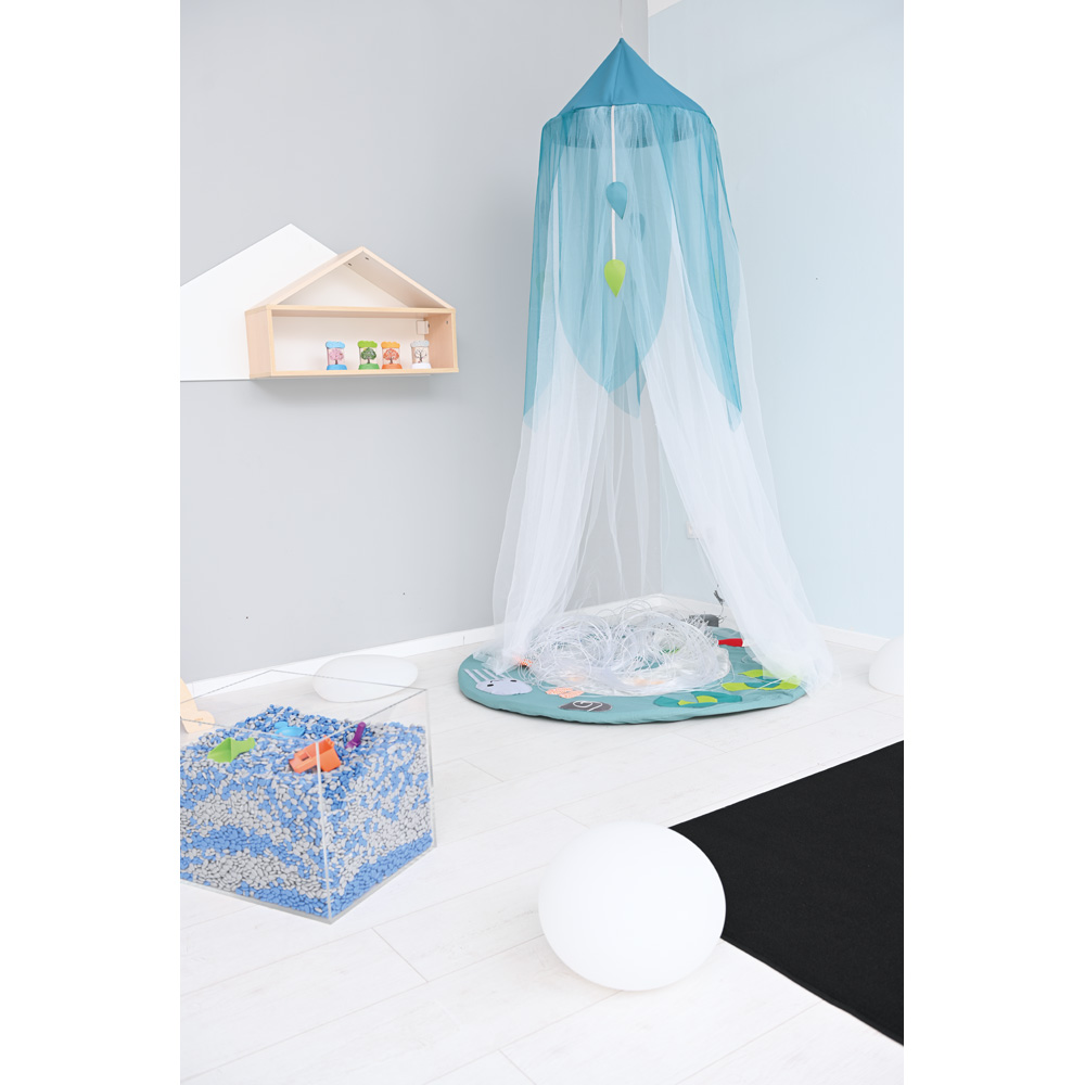 Baldachim wykonany z cienkiej, transparentnej tkaniny poliestrowej (Panama Stretch). Doskonale sprawdzi się powieszony nad matą sensoryczną. Zawiera elementy ozdobne w postaci listków z trwałej tkaniny. • wys. 245 cm • szer. 60 cm