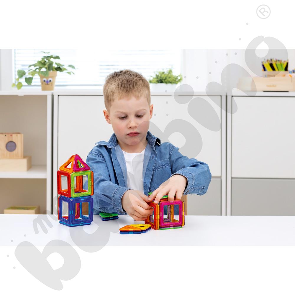 Magformers to klocki z wbudowanymi silnymi magnesami neodymowymi. Za pomocą trójkątów, kwadratów, pięciokątów i innych kształtów, można zbudować wspaniałe trójwymiarowe budowle, począwszy od prostych figur, skończywszy na pomysłowych budowlach. Zestawy różnią się ilością elementów i zawartością (różne kształty). Niektóre zestawy zawierają koła, dzięki którym można zbudować również pojazdy. Magformers to kreatywne klocki, które dają nieograniczone możliwości zabawy. Klocki kształtują i rozwijają wyobraźnię dziecka. W zabawie można korzystać z dołączonej do zestawu instrukcji lub innych przykładów zamieszczonych na stronie magformersworld.com lub własnej wyobraźni. • wym. elem od 5,5 do 7 cm