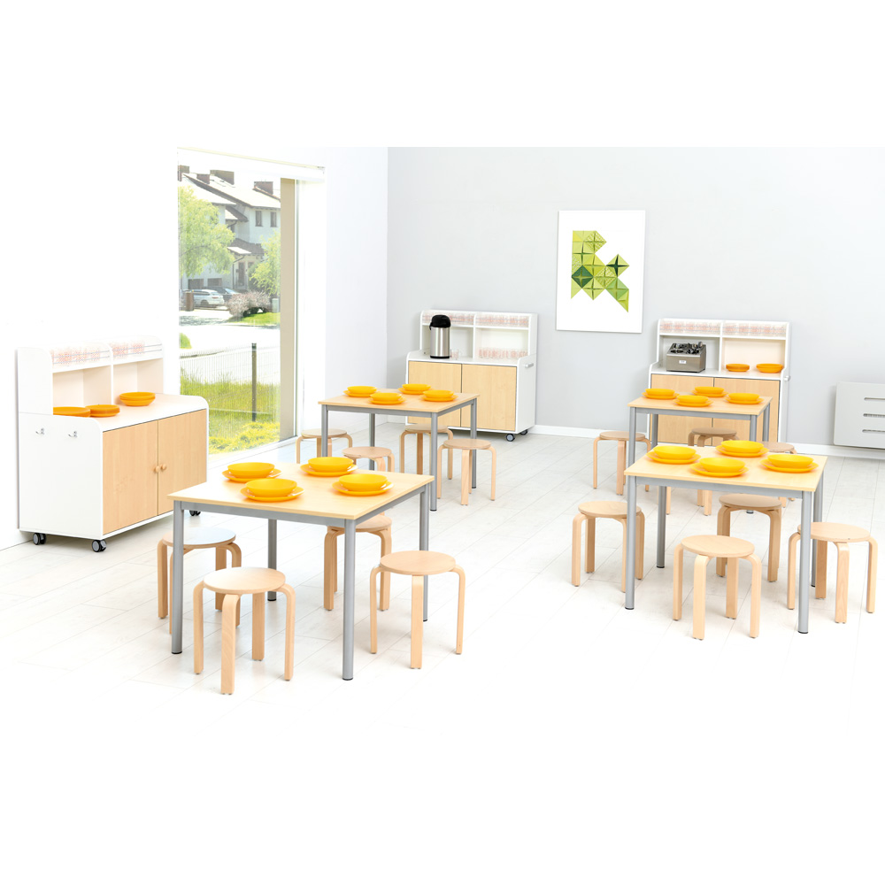 Stołówka szkolna wymaga odpowiedniego wyposażenia łatwego w utrzymaniu czystości. Stoły Mila pokryte laminatem HPL nie tylko spełniają te wymagania, dodatkowo są odporne na zarysowania oraz wysoką temperaturę. Warta podkreślenia jest także różnorodność kształtów stołów i ich bogata kolorystyka utrzymana w ciepłych odcieniach. Wybierając nie tylko klasyczne stały prostokątne a np. trójkątne czy trapezowe mamy dużo większe możliwości aranżacji stołówki w szkole czy przedszkolu bez względu na jej powierzchnię. Duży wybór krzeseł, jaki znajdą Państwo w sklepie internetowym Moje Bambino także pozwala na urządzenie zarówno klasycznej stołówki, jak i tej w nowoczesnym wydaniu z ergonomicznymi krzesłami z kolorowego tworzywa.