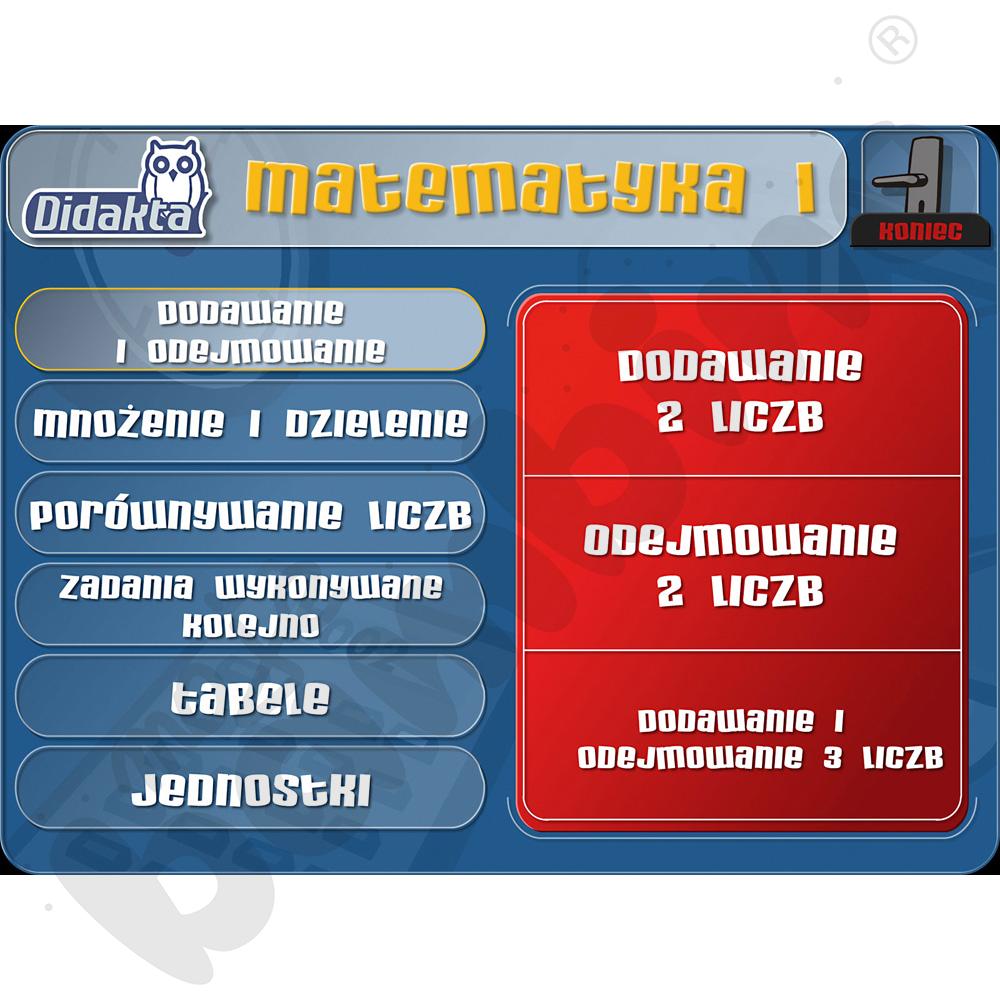 Didakta Matematyka 1 to multimedialny program edukacyjny dla uczniów klas 1-6 szkoły podstawowej, umożliwiający samodzielne ćwiczenie i sprawdzanie umiejętności matematycznych w zakresie liczb całkowitych, ujemnych, dziesiętnych i ułamków. Interaktywne zadania wspierają doskonalenie dodawania, odejmowania, mnożenia, dzielenia, orientacji na osi liczbowej oraz porównywania jednostek.