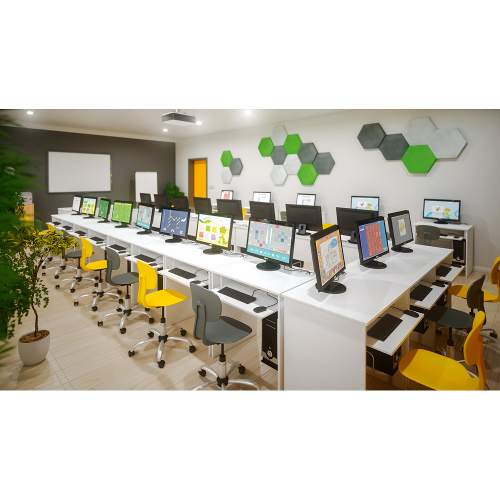 Wyposażenie pracowni informatycznej dostępne w sklepie Moje Bambino obejmuje zarówno sprzęt elektroniczny (komputery, monitory, laptopy), jak i meble. W ofercie znajdą Państwo różnego kształtu biurka z regulowaną wysokością nóżek (pozwalającą dopasować je do wzrostu ucznia), krzesła obrotowe, szafki do przechowywania urządzeń, stoliki oraz regały. Pracownia komputerowa w szkole ponadpodstawowej to miejsce, w którym młodzież zdobywa wiedzę informatyczną, pozwalającą jej na poruszanie się we współczesnym świecie, może poznać np. tajniki kodowania i rozwinąć pasje, dzięki którym zwiększy swoje szanse na zdobycie w przyszłości interesującego ją zawodu. Warto zatem zadbać o jak najlepsze wyposażenie tego pomieszczenia, zwracając baczną uwagę także na nowoczesne pomoce dydaktyczne, takie jak zestawy i stoły multimedialne, również obecne w naszej ofercie. Aranżacja pracowni informatycznej może mieć różnoraki charakter - w zależności od pomysłu oraz potrzeb mogą znajdować się w niej jednoosobowe biurka z obrotowymi krzesłami albo stoliki, przy których usiąść może kilku uczniów jednocześnie.
