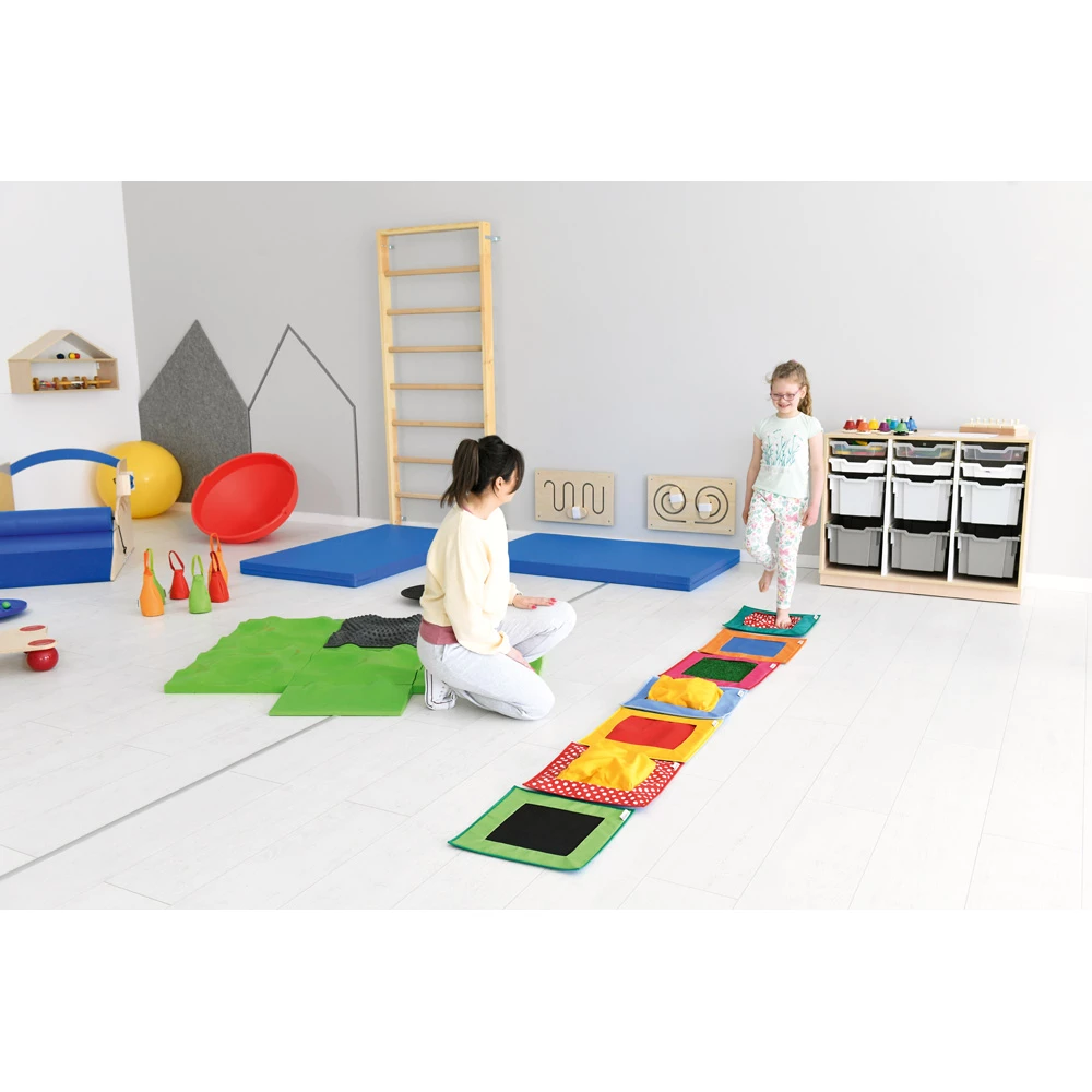 - Fakturowe kwadraty – zestaw podstawowy – modułowe elementy w formie kwadratów o różnorodnych fakturach, które wspierają integrację sensoryczną. Dzieci mogą po nich chodzić boso, rozwijając świadomość ciała i zdolność rozpoznawania różnych struktur.