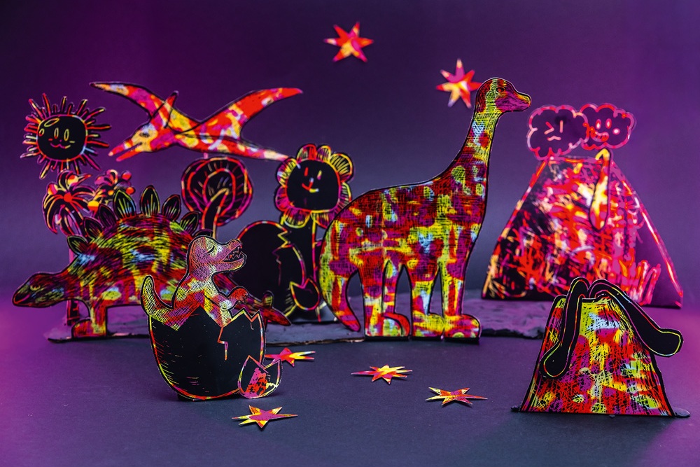 - Wybierz z zestawu szablonów dinozaury i odrysuj je na kartonie holograficznym.