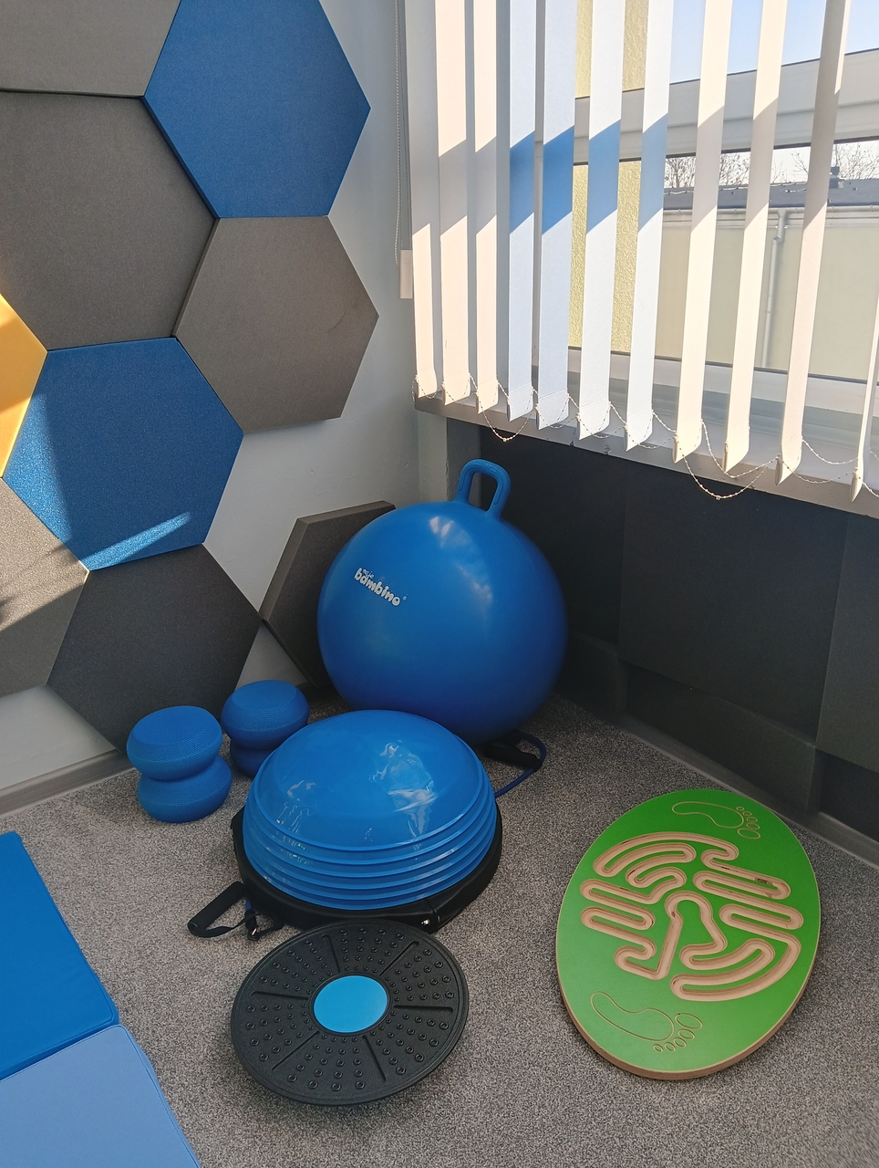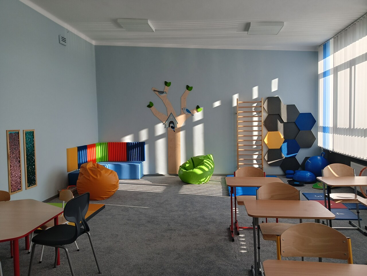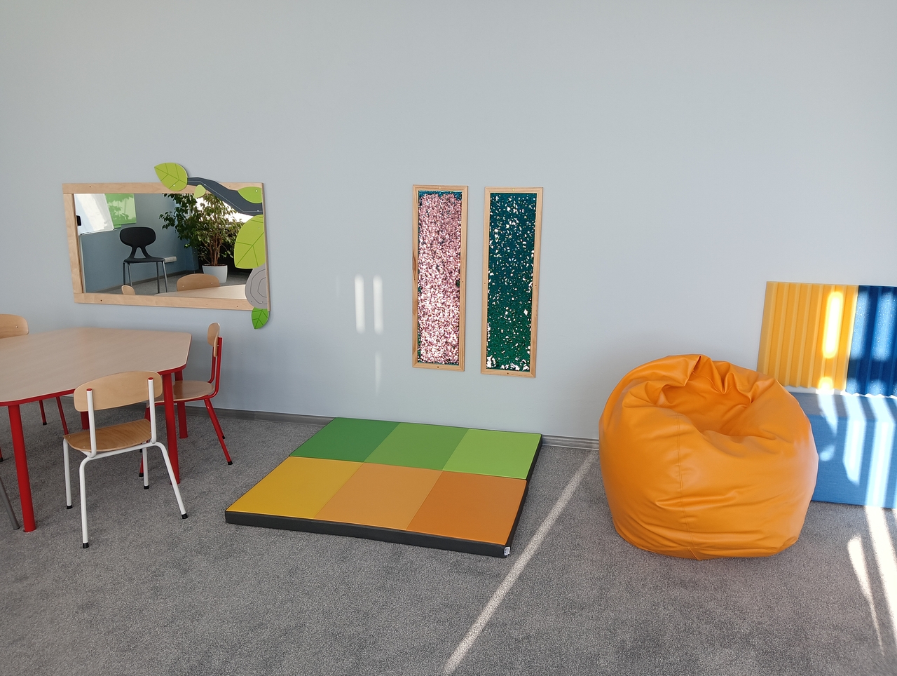 Wnętrze łączy ergonomiczne krzesła, miękkie pufy i gruszki z różnorodnymi elementami dekoracyjnymi i sensorycznymi, tworząc przytulne, bezpieczne i przyjazne dzieciom otoczenie.